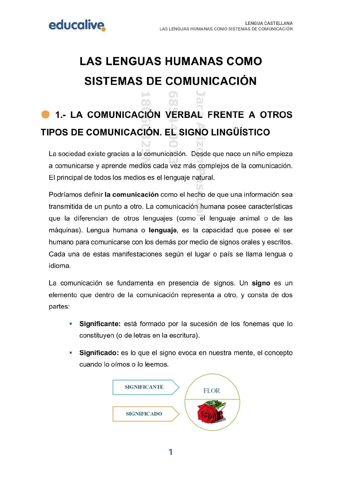 Documento de Educalive sobre Las Lenguas Humanas como Sistemas de Comunicación. El Pdf explora la comunicación verbal, las características y clasificación del signo lingüístico, y el proceso de comunicación. Es un material de Bachillerato para la asignatura de Idiomas.