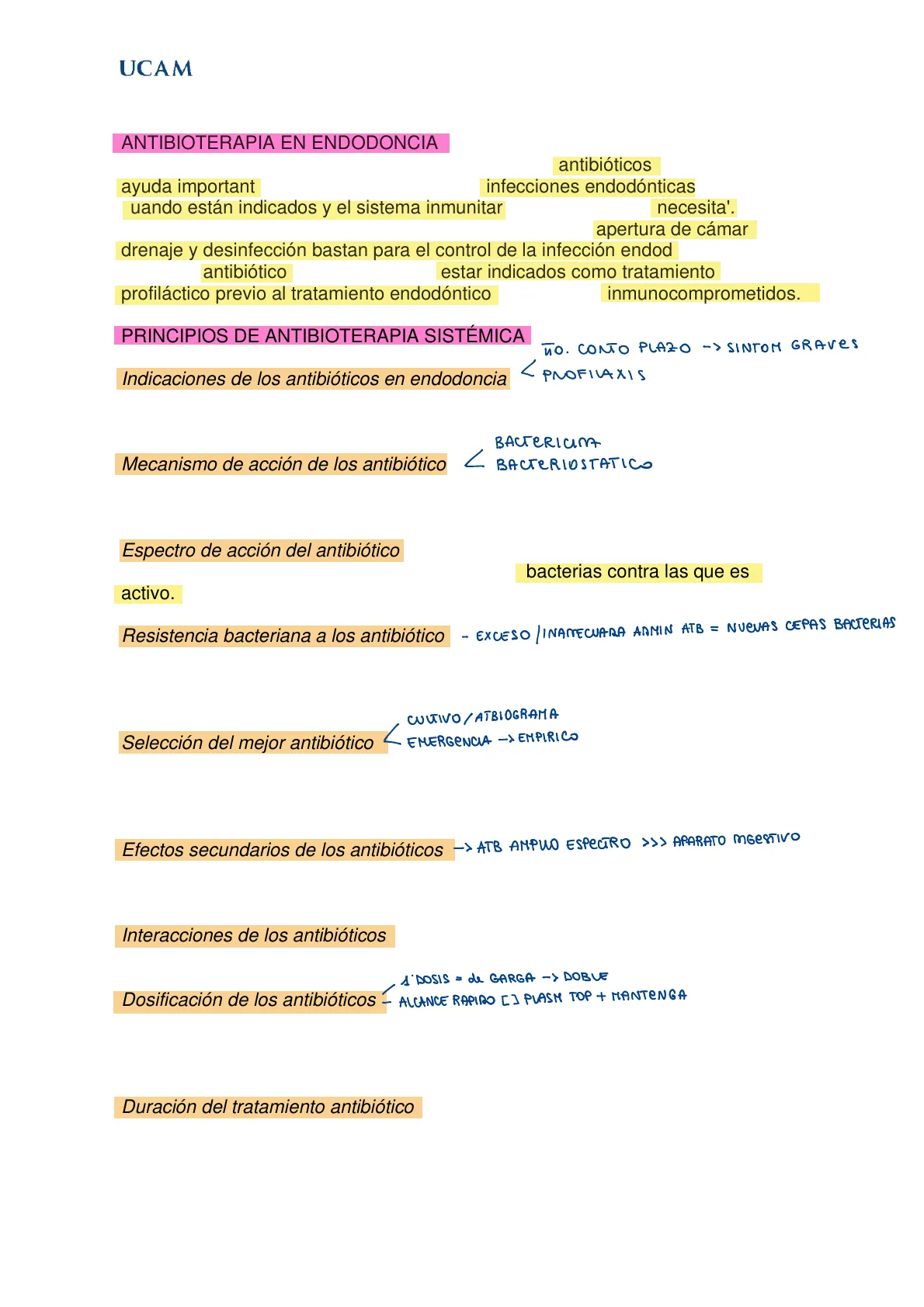 Documento de UCAM sobre medicación sistémica en el tratamiento endodóntico. El Pdf detalla la antibioterapia y el uso de analgésicos/antiinflamatorios, cubriendo indicaciones, mecanismos, espectro, resistencia, selección, efectos secundarios, interacciones y dosificación de antibióticos para el estudio universitario.