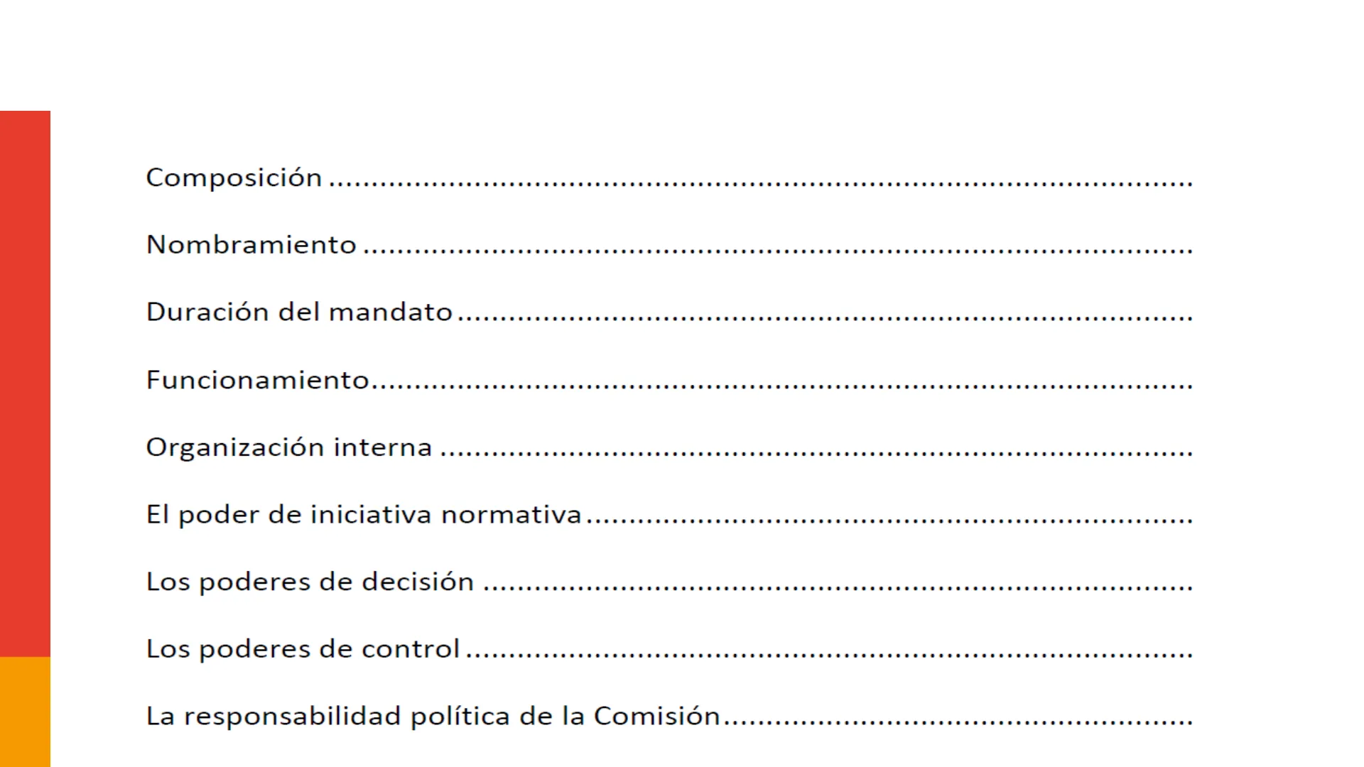 Composición Nombramiento Duración del mandato Funcionamiento Organización interna El poder de iniciativa normativa Los poderes de decisión Los poderes de control La responsabilidad política de la Comisión