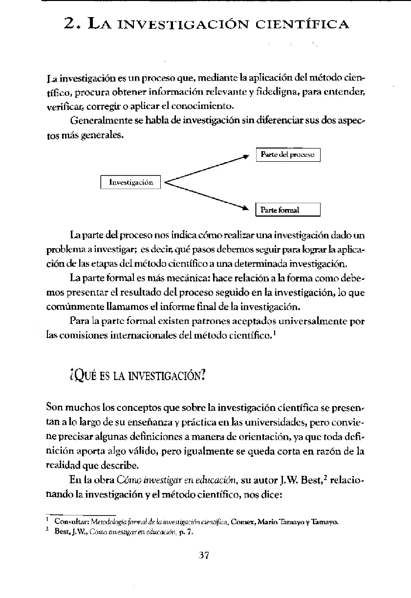 1 Consultar: Metodologia formal de la investigación cientifica, Comex, Mario Tamayo y Tamayo. 2 Best, J. W., Cómo investigar en educación, p. 7. 3738 La investigación científica "Consideramos la investigación como el proceso más formal, sistemático e intensivo de llevar a cabo el método científico del análisis. Comprende una es- tructura de investigación más sistemática, que desemboca generalmente en una especie de reseña formal de los procedimientos y en un informe de los resultados o conclusiones. Mientras que es posible emplear el espiritu científico sin investiga- ción, sería imposible emprender una investigación a fondo sin emplear espíritu y método científico."