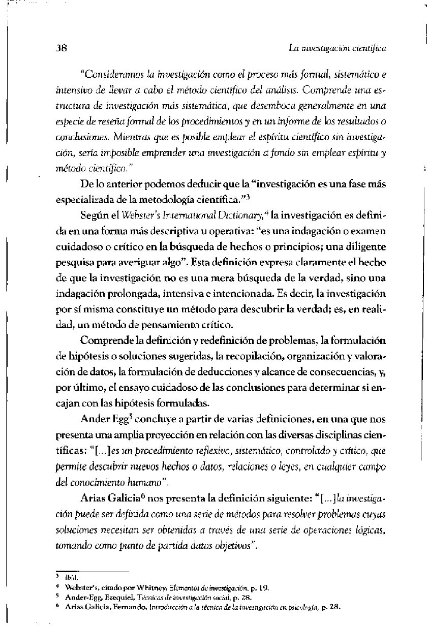 3 Ibid. 4 Webster's, citado por Whitney, Elementos de investigación, p. 19. 5 Ander-Egg, Ezequiel, Técnicas de investigación social, p. 28. Arias Galicia, Fernando, Introducción a la técnica de la investigación en psicología, p. 28. 1 :39 ¿Qué es la investigación!