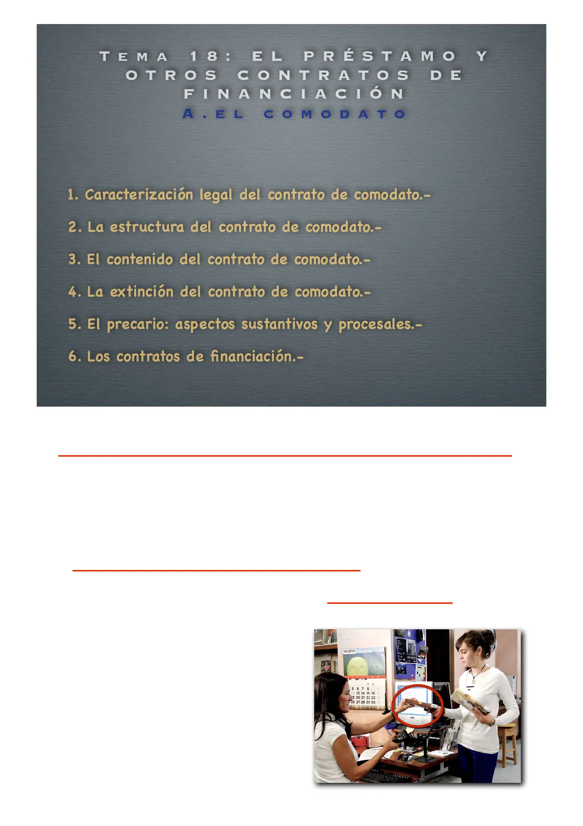 > El CC recoge la definición del PRÉSTAMO en el art. 1740 distinguiendo entre el préstamo de uso (comodato), y el préstamo de consumo (mutuo). DIFERENCIA: El objeto del comodato es una cosa no fungible y en el mutuo es dinero u otra cosa fungible. Art. 1740 CC: "Por el contrato de préstamo, una de las partes entrega a la otra, o alguna cosa no fungible, para que use de ella por cierto tiempo y se la devuelva, en cuyo caso se llama comodato, o dinero u otra cosa fungible, con condición de devolver otro tanto de la misma especie y calidad, en cuyo caso conserva simplemente el nombre de préstamo. El comodato es esencialmente gratuito. El simple préstamo puede ser gratuito o con pacto de pagar interés". > El comodato es un contrato real por el que el comodante entrega al comodatario una cosa no fungible para que la use durante un tiempo determinado, después del cual deberá devolverla. 10|2010 - 2 5 6 7 8 9 10 13 14 15 16 17 19 20 21 22 23 24 26 27 28 29 30 31> Las 4 características fundamentales del contrato de comodato son: