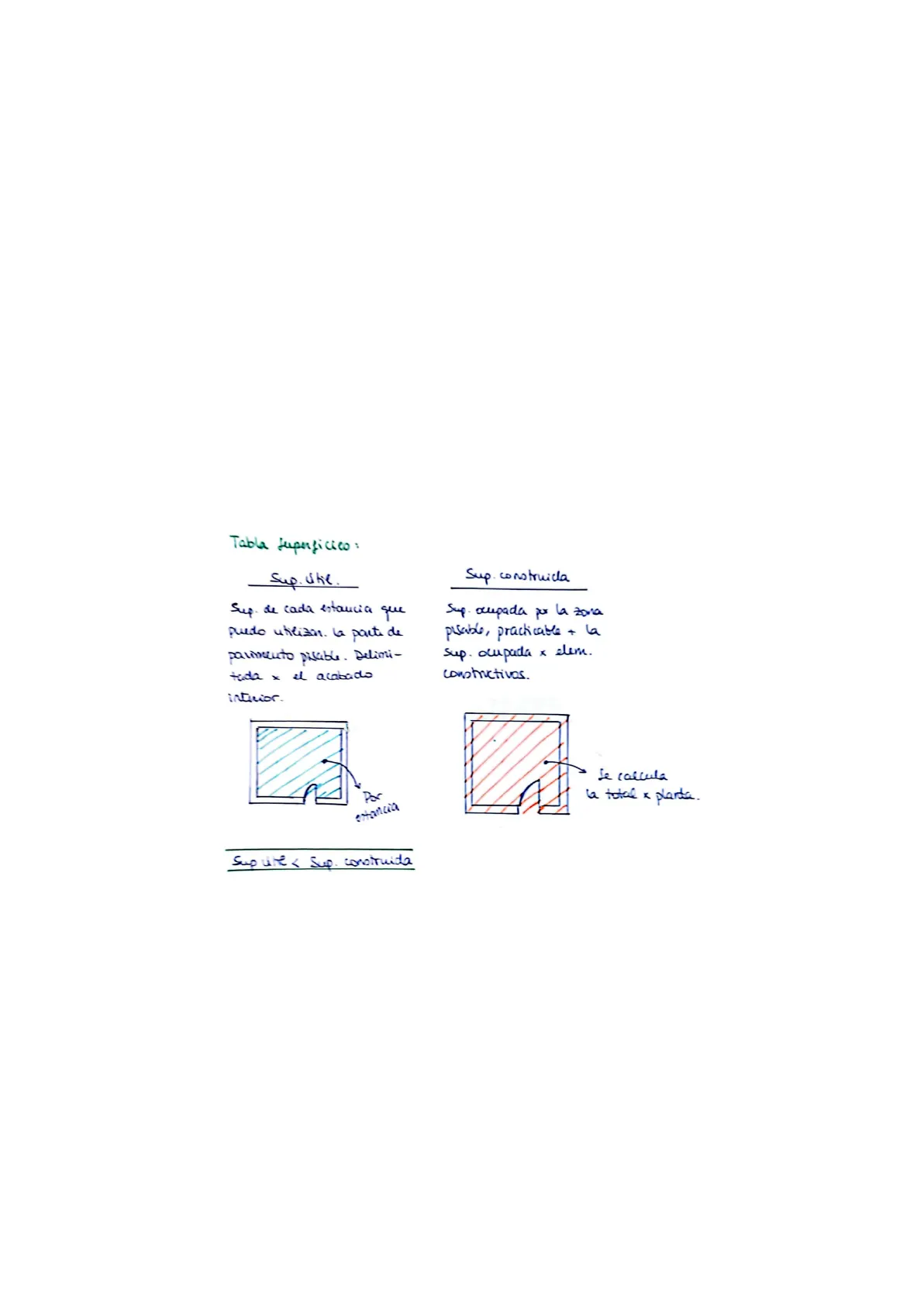 Tabla Superficieo: Sup. Stil. Sup. construida Sup. de cada estancia que puedo utilizar. la parte de pavimento pisable. Delimi- toda x el acabado interior. Sup. ocupada por la zona pesable, practicable + la sup. ocupada x elem. constructivos. Se calcula la total x planta. estancia Sup vite & Sup. construida