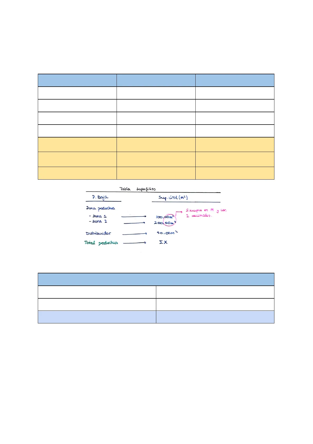 En la primera entrega no poner el cómputo. Planta baja: ZONA ESTANCIA SUPERFICIE ÚTIL (m2) Productiva Zona 1 … Zona 2 . . ... Circulación .. Total productiva 2 X m Total servicios X m Total Planta baja Suma de todas las anteriores Tabla superficies P. Baja Sup. útil (m2) Zona productiva Siempre en m y con 2 decimales. - zona 1 100,00 m - zona 2 200,00 m Distribuidor 50,00m2 Total productiva EX