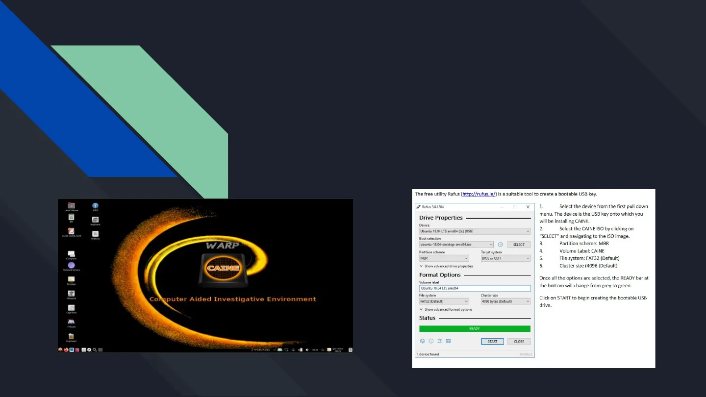 WARP Computer CAINE Computer Aided Investigative Environment The free utility Rufus (http://rufus.ie/) is a suitable tool to create a bootable USB key.