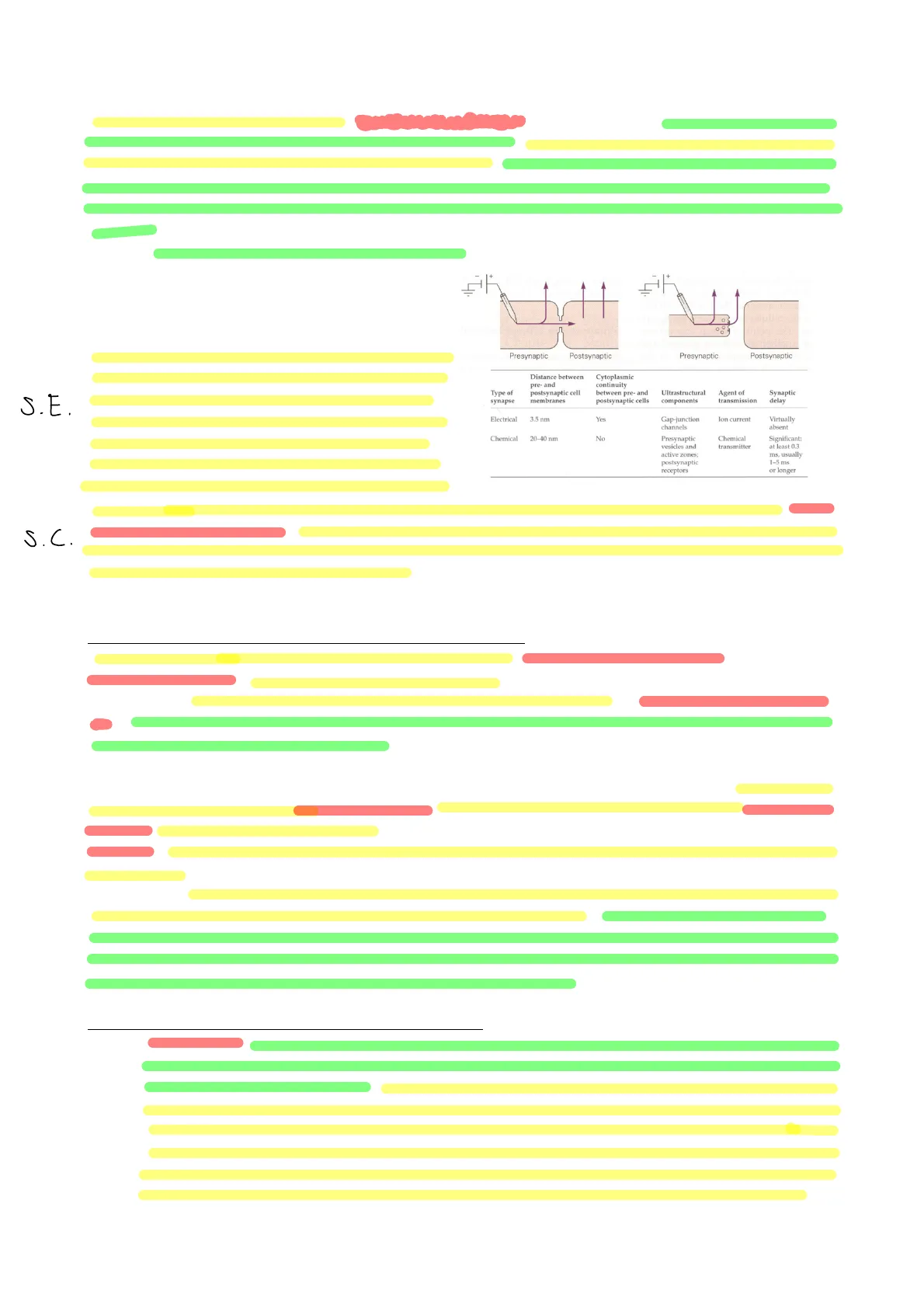 Caratteristiche morfologiche delle due tipologie di sinapsi Nella sinapsi elettrica le due membrane sono vicinissime, la distanza è di circa 4 nm, in quanto sono presenti i connessoni che uniscono una cellula all'altra. Al contrario le sinapsi chimiche presentano un vallo sinaptico più ampio, che può andare da 20 a 50 nm. Le sinapsi elettriche presentano quindi continuità citosolica, mentre c'è assoluta individualità delle due cellule nelle sinapsi chimiche. Le sinapsi elettriche presentano una singola componente ultrastrutturale, ovvero le gap junctions, mentre le sinapsi chimiche sono caratterizzate da una struttura enormemente complessa. L'agente che trasporta l'informazione è la corrente ionica nel caso delle giunzioni comunicanti, il messaggero chimico nel caso delle sinapsi chimiche. Il ritardo, cioè il tempo che il neurone pre sinaptico impiega per invocare una risposta nel neurone post-sinaptico, tempo necessario perché le correnti locali portino alla depolarizzazione della cellula post-sinaptica, è brevissimo nel caso delle sinapsi elettriche, mentre è presente un ritardo significativo a livello delle sinapsi chimiche, dovuto alla complessità strutturale. Questo ritardo ha un minimo di circa 0,8 millisecondi ma può essere anche più lungo, qualche ms. Anche se può sembrare un tempo brevissimo, se sono presenti 100 sinapsi in serie diventano 80 ms, quindi la singola sinapsi chimica è comunque efficiente ma è molto più lenta rispetto a quella elettrica.