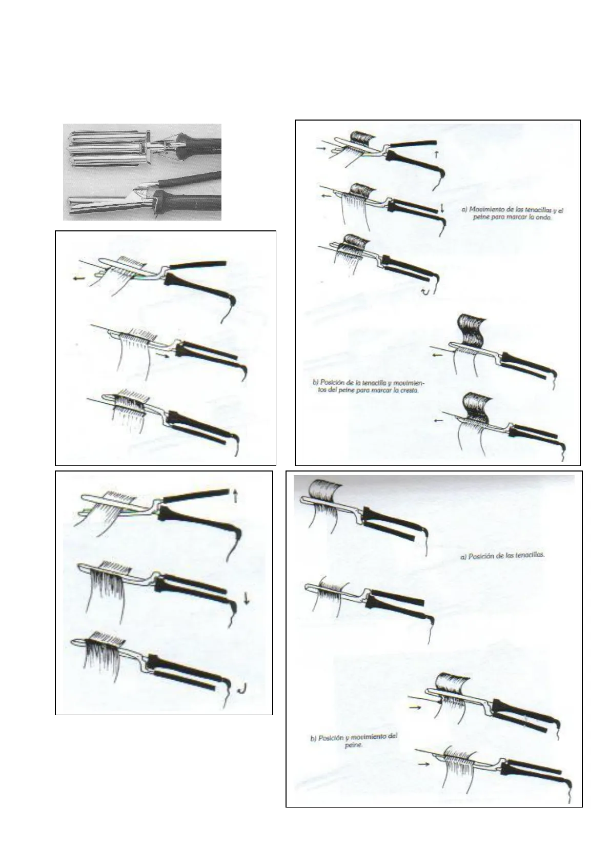 1 1 1 a) Movimiento de las tenacillas y el peine para marcar la onda - 2 b) Posición de la tenaclila y movimien- tos del peine para marcar la cresta. a) Posición de las tenacillas. J b) Posición y movimiento del peine.