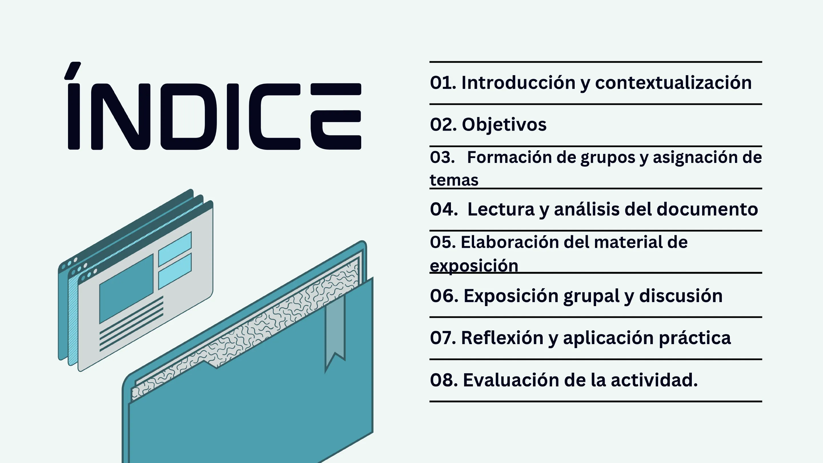01. Introducción y contextualización 02. Objetivos 03. Formación de grupos y asignación de temas 04. Lectura y análisis del documento 05. Elaboración del material de exposición 06. Exposición grupal y discusión 07. Reflexión y aplicación práctica 08. Evaluación de la actividad.1.