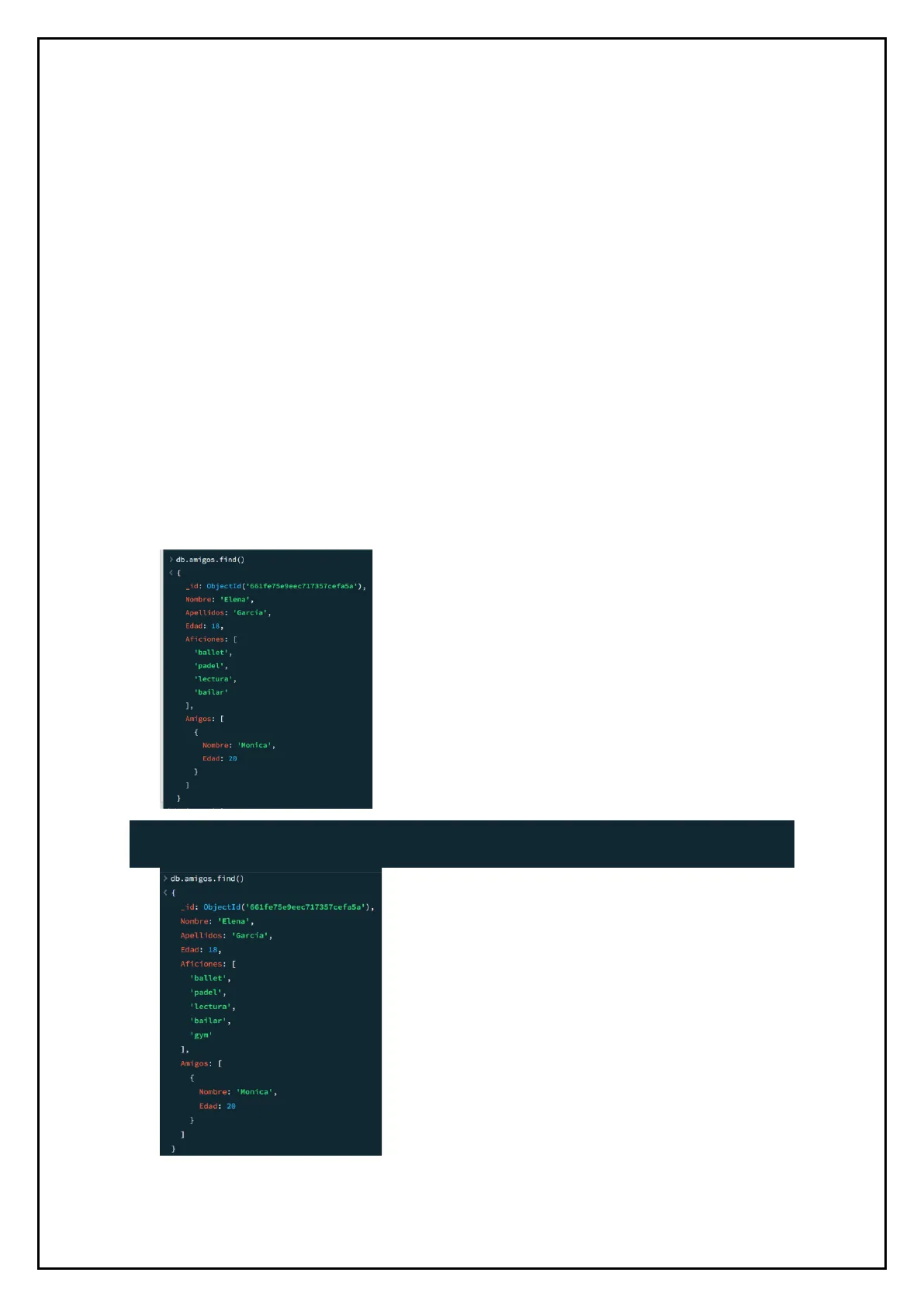 > db.amigos. find() _id: ObjectId('661fe75e9eec717357cefa5a'), Nombre: 'Elena', Apellidos: 'García', Edad: 18, Aficiones: [ 'ballet' , 'padel', 'lectura', 'bailar' ], Amigos: [ { Nombre: 'Monica', Edad: 20 1 db.amigos.updateOne({Nombre:"Elena"}, {$push: {Aficiones: "gym"}}) > db.amigos. find() _id: ObjectId('661fe75e9eec717357cefa5a'), Nombre: 'Elena' , Apellidos: 'García', Edad: 18, Aficiones: [ 'ballet', 'padel ', 'lectura' , 'bailar', ' gym ], Amigos: [ Nombre: 'Monica', Edad: 20 1