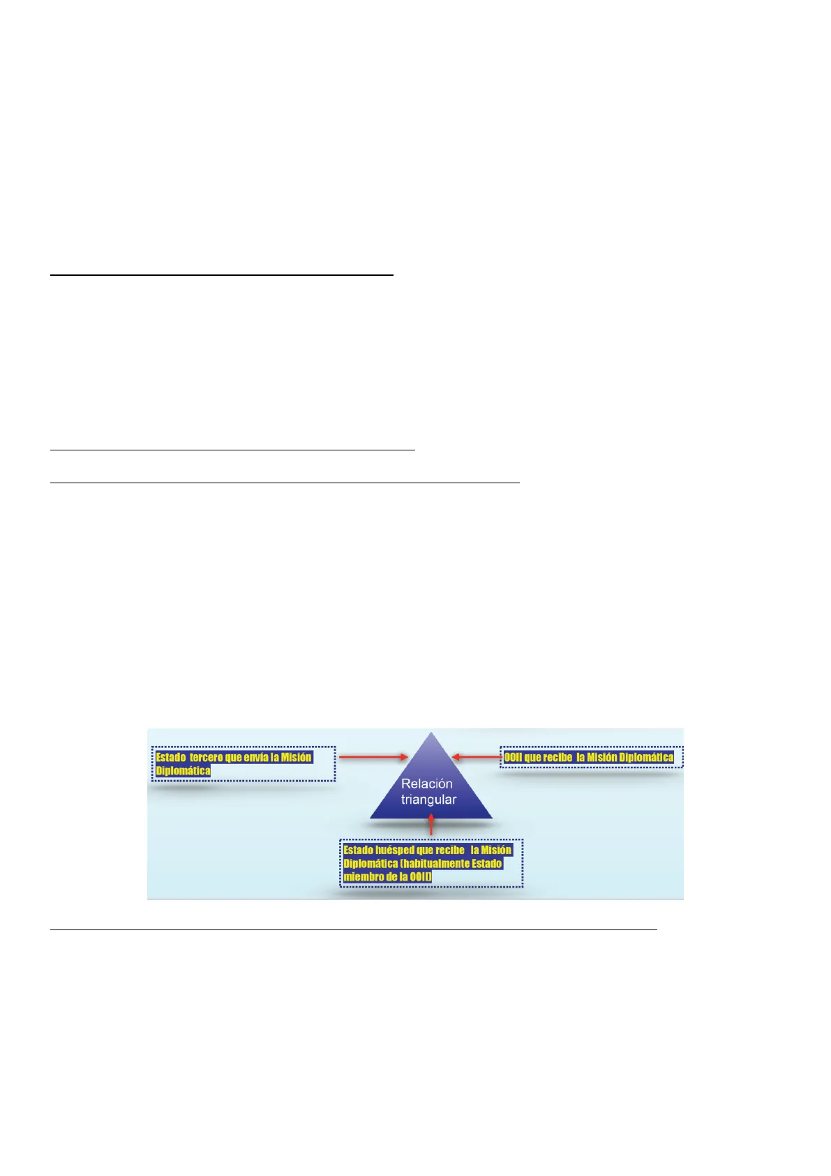 -Derecho de LEGACIÓN de las OOII (pueden ser temporales o permanentes: >ACTIVA: derecho a enviar representantes diplomáticos: +Acreditación de misiones diplomáticas de las OOII: ante otra OOII, o ante otro Estado +Acreditación de misiones diplomáticas de las OOII: ante la ONU o ante sus órganos especiales > Hay que recordar que la practica internacional de las OOII ha demostrado: Envío de misiones a Estados Parte ONU y no a terceros Estados > por ejemplo: la práctica de la Unión Europea es enviar misiones permanentes a algunos de los Estados miembros de la UE. >PASIVA: derecho a recibir representantes diplomáticos > acreditación de misiones diplomáticas de los Estados ante las OOII (Estados terceros no partes de la OOII, Misiones permanentes) Estado tercero que envia la Misión Diplomática OOll que recibe la Misión Diplomática Relación triangular Estado huésped que recibe la Misión Diplomática (habitualmente Estado miembro de la OOII)
