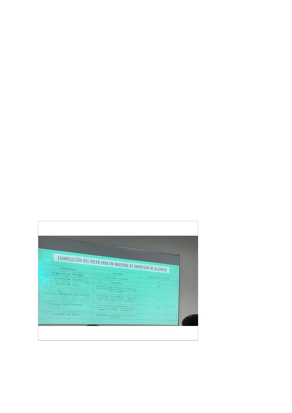 COMPONENTE FUNCIÓN PORCENTAJE DE PESO Alginato de Potasio Alginato soluble Sulfato de Calcio Reactivo 16 Oxido de zinc Particulas de relleno(influencia en las propiedades físicas y el tiempo de fraguado A Fluoruro potásico de Titanio Endurecedor de yeso( garantiza una Superficie dura y densa cunado el yeso se asiente en la impresion) Tierra de diatomeas Partículas de relleno(aumenta La fuerza y la rigidez, textura suave y superficie firme, no pegajosa) 60 Fosfato de Sodio Retardador (controla el tiempo de fraguado)También se le a agregado un producto para que el polvo de alguinato no se ha tan volátil cuando se abre o se mezcla para guano sea dañino a la hora de respirar.