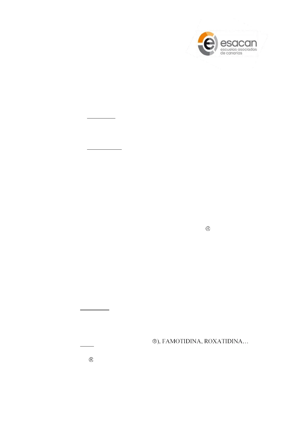 1. Fármacos Antiácidos: Su acción farmacológica es neutralizar el ácido clorhídrico por reacción química en el estómago. Atendiendo a su mecanismo de acción, se distinguen dos tipos: i. Sistémicos: son aquellos que pasan a la sangre, produciendo la llamada alcalosis sistémica. Son de rápida acción, pero poco duradera, pudiendo aparecer un efecto rebote. El ejemplo más representativo de este grupo lo constituye el Bicarbonato Sódico. No son aconsejables. ii. No sistémicos: Reaccionan con el ácido clorhídrico estomacal, y no se van a absorber. Es una acción lenta, pero sostenida y sin efecto rebote. Dentro de este amplio grupo, destacamos las sales de Aluminio, sales de Magnesio y sales de Calcio. Las sales de Aluminio y Calcio son astringentes, mientras que las de Magnesio son laxantes. Las sales de Aluminio pueden ocasionar una depleción de los fosfatos, de ahí que sea importante en dietas pobres en fosfatos. Asimismo los antiácidos se deben usar con precaución en casos de insuficiencia renal, ya que puede haber una acumulación de aluminio, calcio o magnesio. Actualmente la terapia antiácidos alcanza una mayor efectividad combinándolos. Este es el caso del Magaldrato o Algeldrato (Asociación de Aluminio (produce estreñimiento) y Magnesio (produce diarrea) (Almax®). Independientemente del tipo de antiácido escogido, la posología para lograr una gran efectividad del tratamiento es la siguiente: 6 veces al día, es decir, antes y después de cada comida principal, excepto la última toma que deberá efectuarse antes de acostarse. 2. Antihistamínicos H2: Su acción sobre los receptores H2 de la Histamina, garantiza una inhibición de la secreción del ácido clorhídrico por parte de las células parietales del estómago. Los fármacos más usados son: a. Cimetidina: Fármaco que se absorbe bien por vía oral, pero que su efectividad se ve alterada por la presencia de alimentos en el estómago. La administración conjunta con antiácidos puede retrasar su absorción, de ahí que se recomiende consumirlos por separado, mediando unos 30 minutos entre uno y otro. b. Otros: RANITIDINA (Zantac®), FAMOTIDINA, ROXATIDINA ... Protectores de la mucosa gástrica: Dentro de este grupo el fármaco más representativo es el SUCRALFATO (Urbal®). Es un derivado de la sacarosa que actúa tapizando la mucosa digestiva, protegiéndola de la acción corrosiva del jugo gástrico.esacan escuelas asociadas de canarias