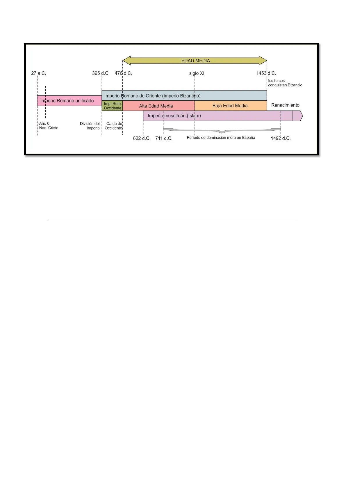 27 a.C. 395 d.C. 476id.C. siglo XI 1453id.C. los turcos ¡ conquistan Bizancio Imperio Romano de Oriente (Imperio Bizantino) Imperio Romano unificado Imp. Rom. Occidente Alta Edad Media Baja Edad Media Renacimiento Imperio, musulmán (Islam) Año 0 Nac. Cristo División del Imperio Caída de Occidentei 622 d.C. 711 d.C. Período de dominación mora en España 1492 d.C.