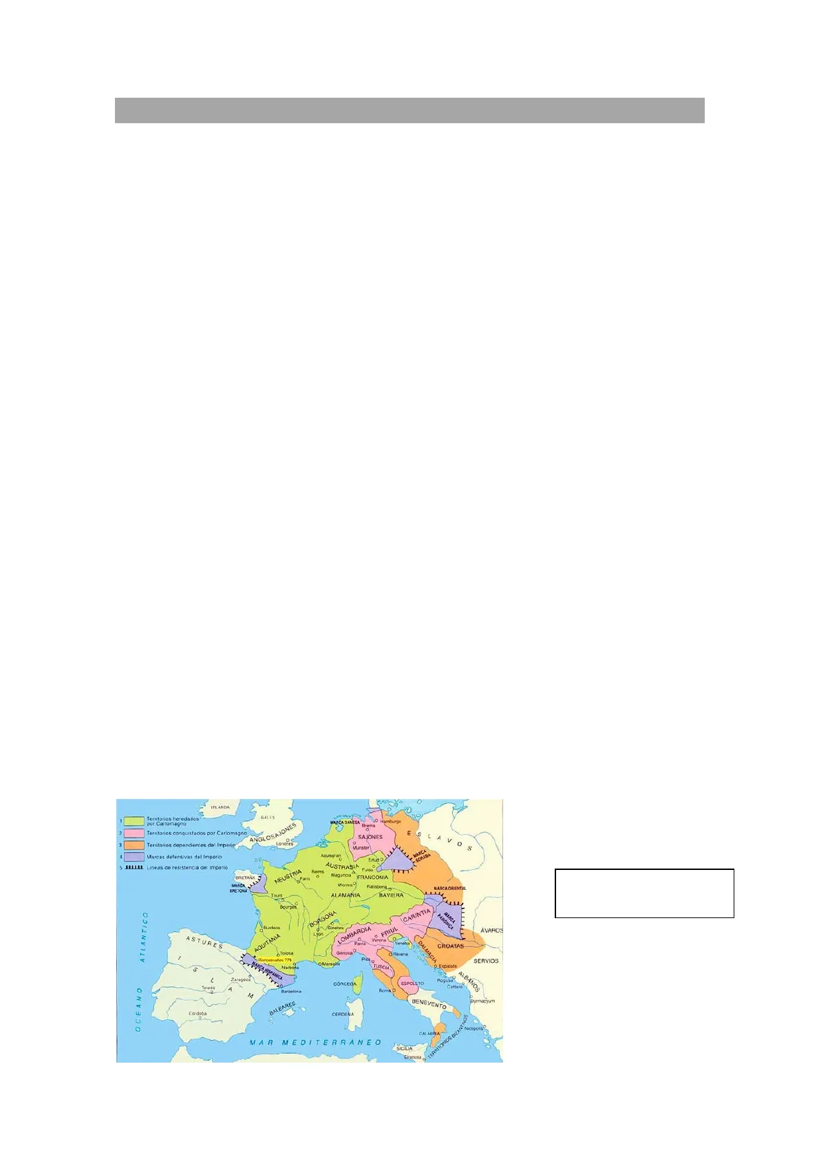 Por otra parte, eran normales las guerras entre los propios reyes europeos o entre los líderes guerreros para quedarse con territorios o aumentar su poder. IRLANDA Terntorios heredados MARCA DANESA · Hamburgo por Carlomagno Broma Terntorios conquistados por Carlomagno E S SAJONES LAV 3 Territorios dependientes del Imperio andres Munster 4 Marcas defensivas del Imperio AUSTRASIA 5 LLLLLL Lineas de resistencia del Imperio Rems Maguncia FRANCONIA Wormsº Ratisbona MARCA ORIENTAL Tour ALAMANIA BAVIERA O Bourges CARINTIA MARCA ATLANTICO Burdeos VGinebra LOMBARDIA FRIUL Veneou CROATAS Tolosa O Rivena Roncesvalles 778 · Marsella TUSCIA o Espalato L Zaragoza RAGUSA Toledo A Barcelona Roma D M Dyrrnacyum Cordoba CERDEÑA 0 Nicopots CALABRIA MAR MEDITERRANEO SICILIA Siracusa IMPERIO CAROLINGIO BORGOÑA PANÓNICA ÁVAROS ASTURES AQUITANIA Verona ( PAVO Génova 9 PISA O DALMACIA O SERVIOS Narbon MARCA HISPÁNICA CORCEGA ESPOLETO Cattaro ALBANOS BALEARES BENEVENTO OCEANO Aquisgran SORABA BRETAÑA MARCA BRETONA NEUSTRIA MARCA o 2 ANGLOSAJONES 1 GALES TERRITORIOS BIZANTINOS