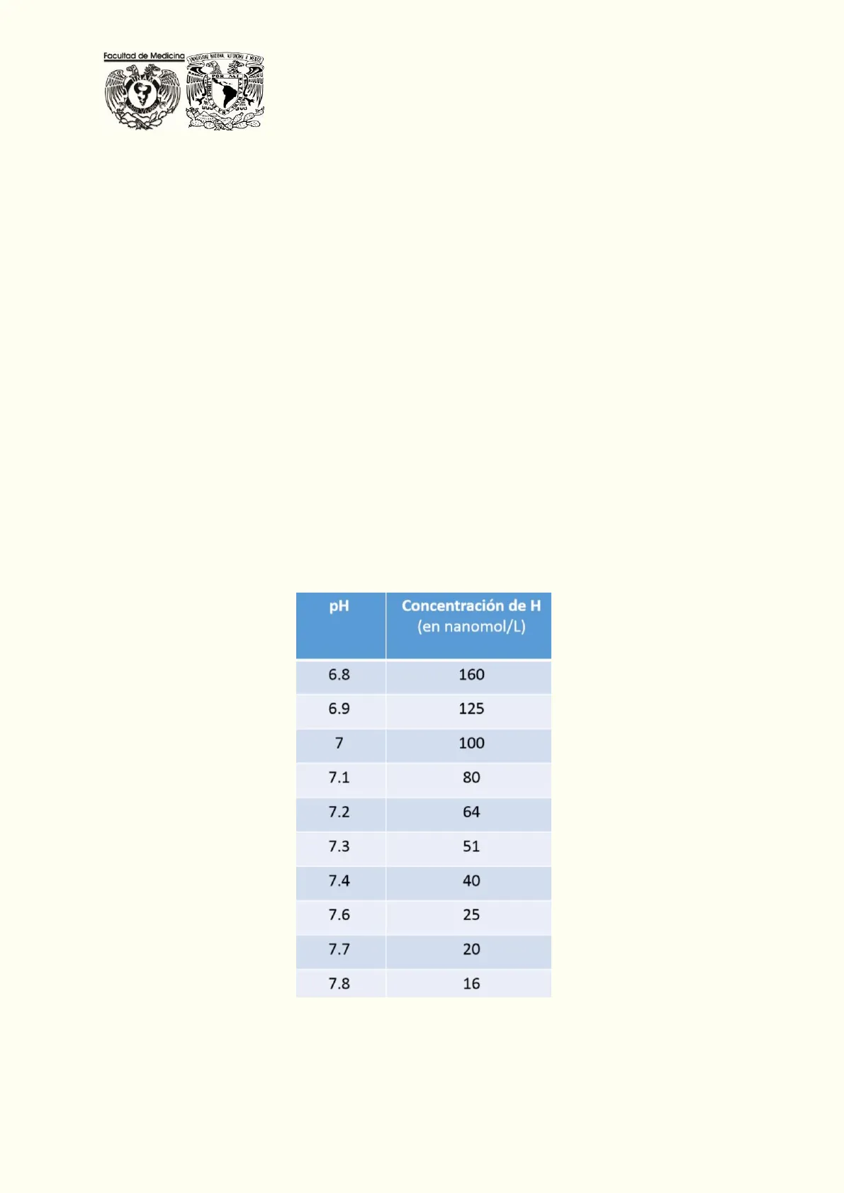 pH Concentración de H (en nanomol/L) 6.8 160 6.9 125 7 100 7.1 80 7.2 64 7.3 51 7.4 40 7.6 25 7.7 20 7.8 16 Tabla 1. Relación entre el pH arterial y la concentración de H+