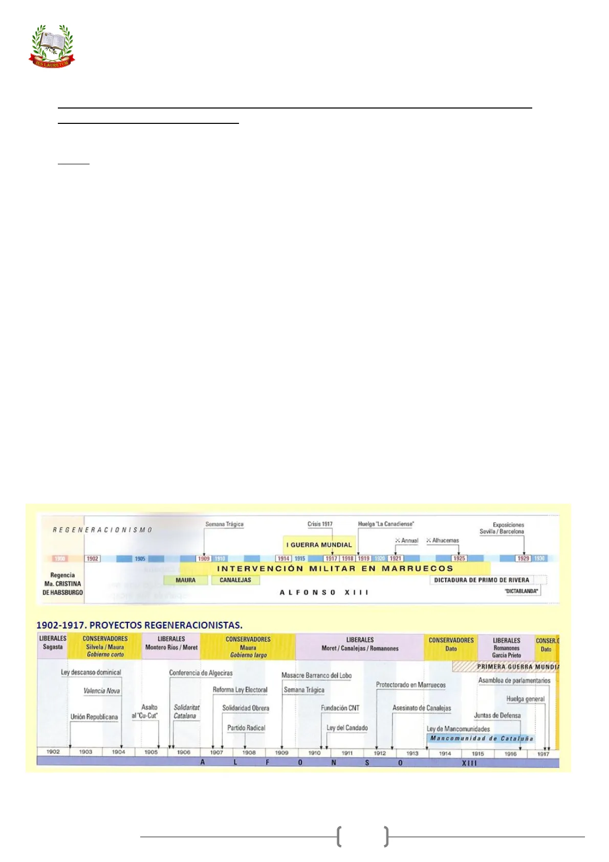 Documento de Ies Lauretum sobre la Historia de España. El Pdf, de Historia para Bachillerato, examina la historia española entre 1902 y 1930, cubriendo la crisis del sistema de la Restauración y la dictadura de Primo de Rivera, con esquemas cronológicos y conceptuales para facilitar la comprensión.