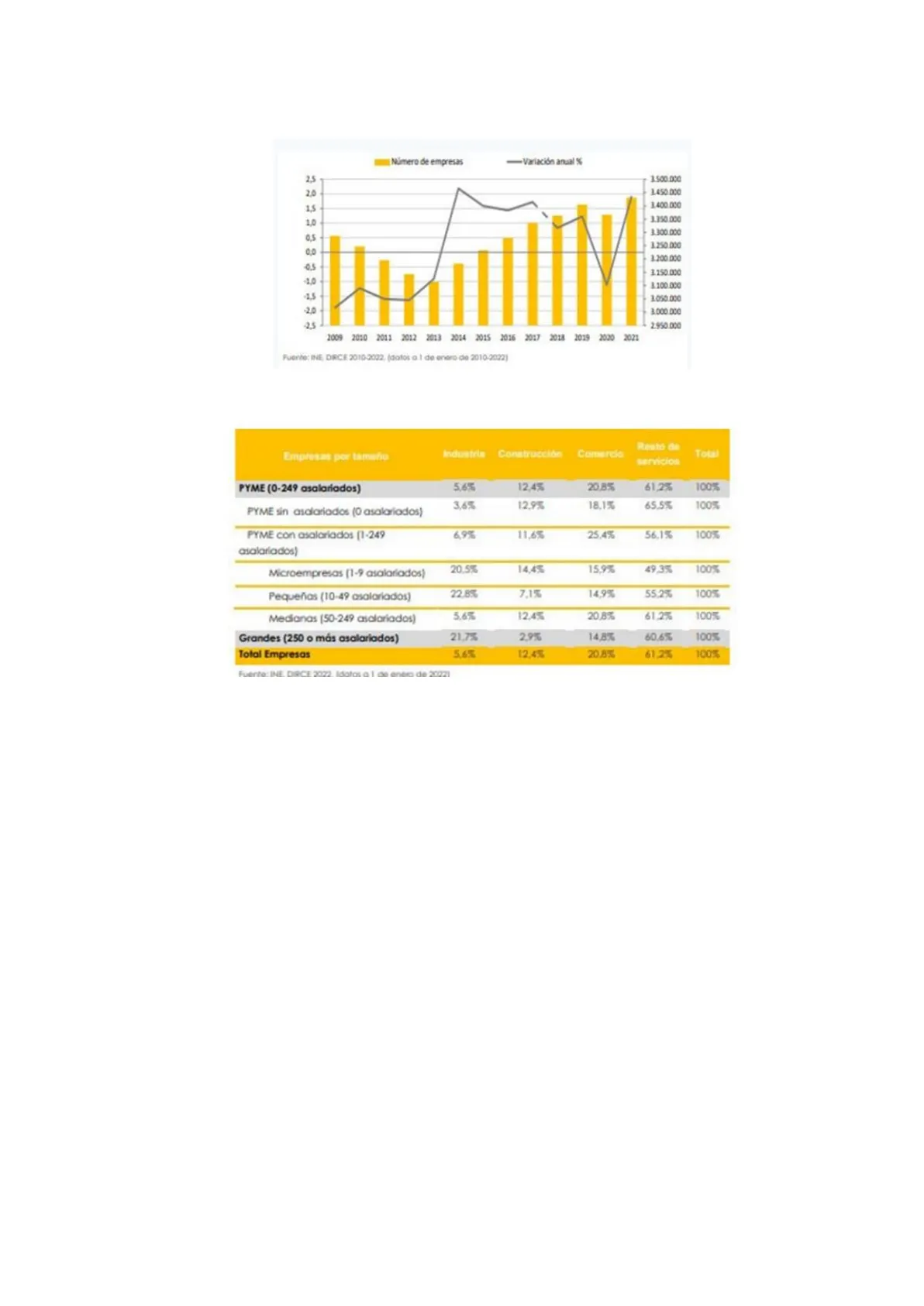 Empresas por tamaño Industria Construcción Comercio Resto de servicios Total PYME (0-249 asalariados) 5,6% 12.4% 20,8% 61,2% 100% PYME sin asalariados (0 asalariados) 3,6% 12,9% 18.1% 65,5% 100% PYME con asalariados [1-249 asalariados) 6,9% 11,6% 25,4% 56,1% 100% Microempresas (1-9 asalariados) 20,5% 14,4% 15,9% 49,3% 100% Pequeñas (10-49 asalariados) 22.8% 7.1% 14,9% 55.2% 100% Medianas (50-249 asalariados) 5,6% 12,4% 20,8% 61.2% 100% Grandes (250 o más asalariados) 21,7% 2,9% 14.8% 60,6% 100% Total Empresas 5.6% 12.4% 20,8% 61,2% 100%