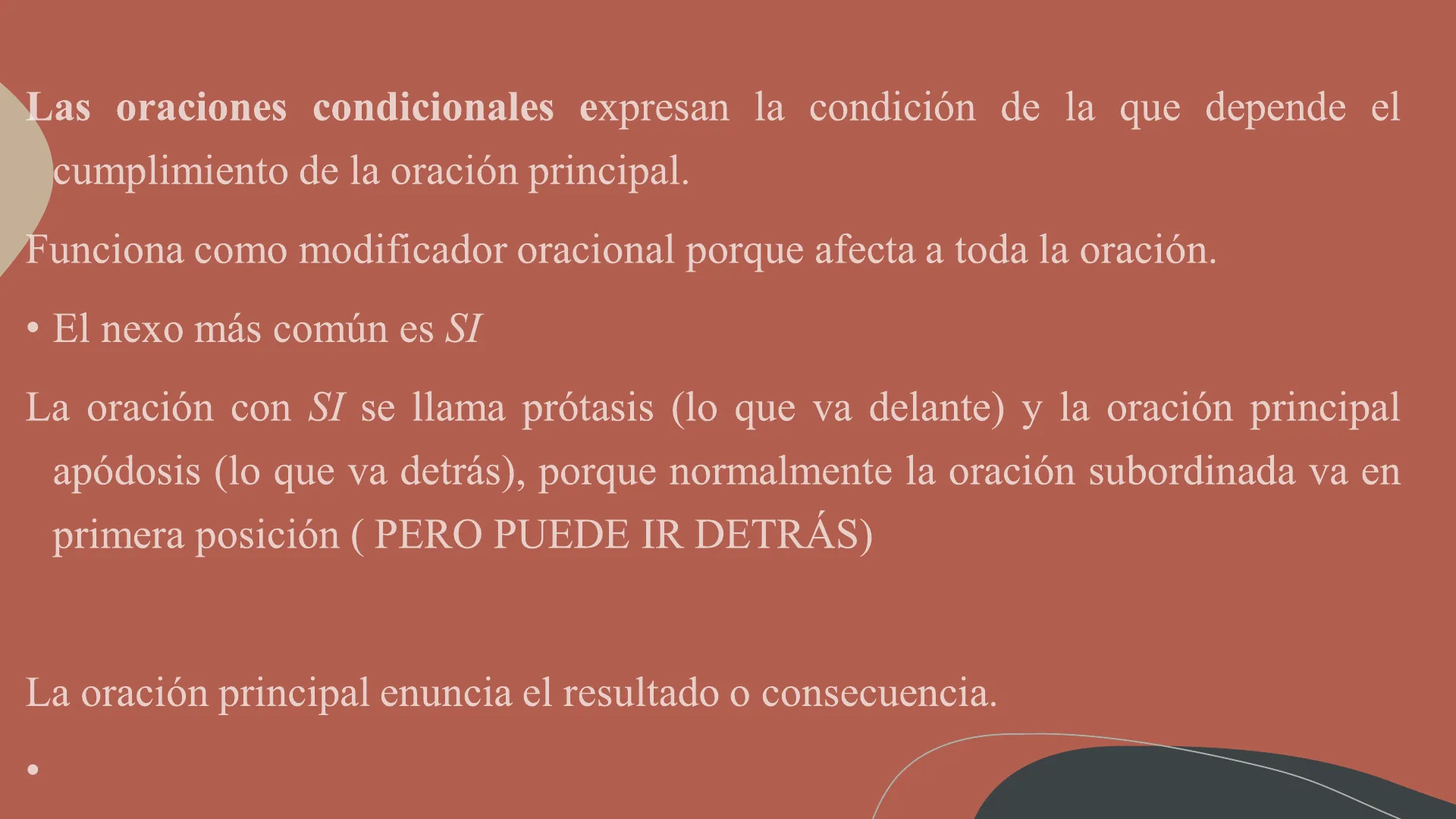 Las oraciones condicionales expresan la condición de la que depende el cumplimiento de la oración principal. Funciona como modificador oracional porque afecta a toda la oración.