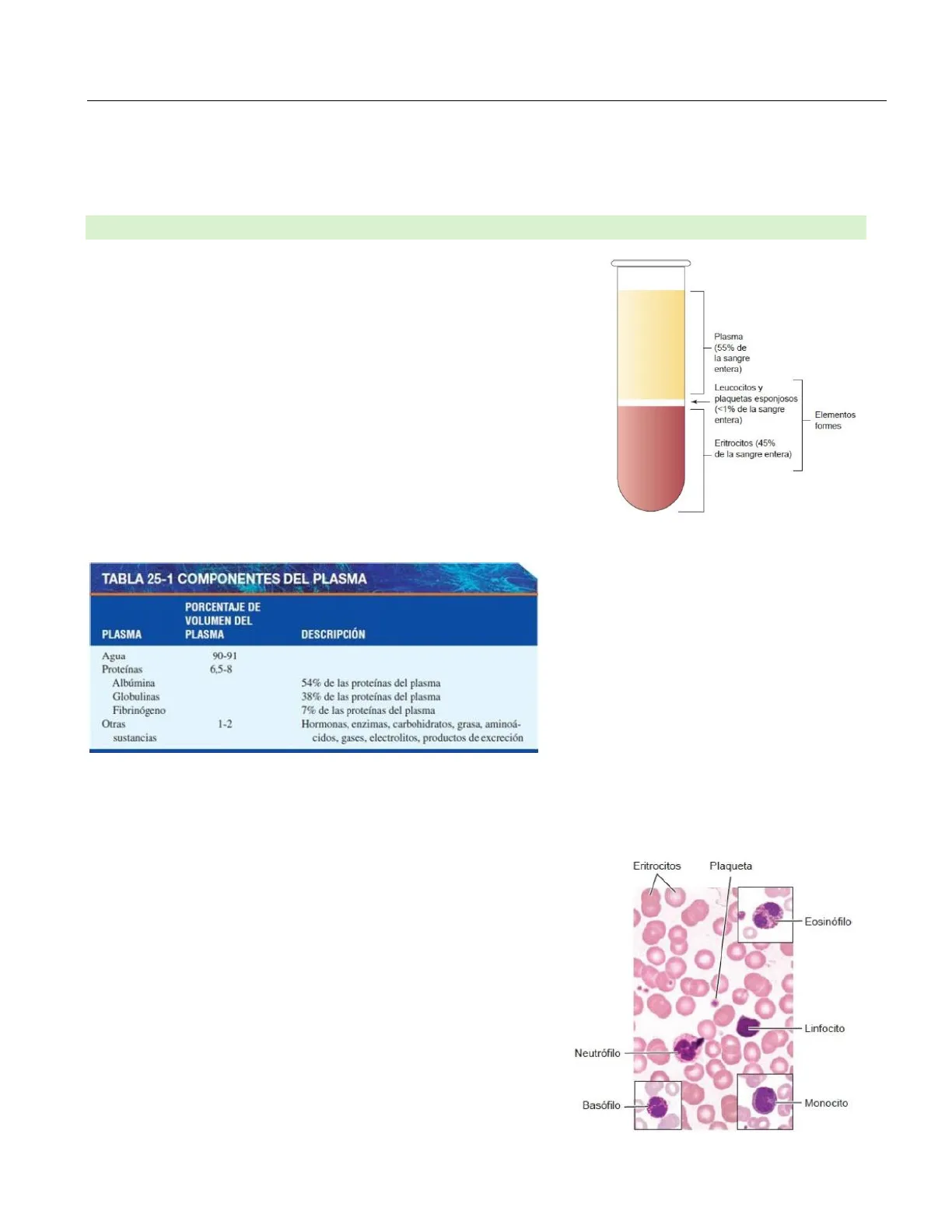 TABLA 25-1 COMPONENTES DEL PLASMA PLASMA PORCENTAJE DE VOLUMEN DEL PLASMA DESCRIPCIÓN Agua Proteínas 90-91 6,5-8 Albúmina 54% de las proteínas del plasma 38% de las proteínas del plasma Globulinas Fibrinogeno 7% de las proteínas del plasma Otras 1-2 Hormonas, enzimas, carbohidratos, grasa, aminoá- cidos, gases, electrolitos, productos de excreción sustancias