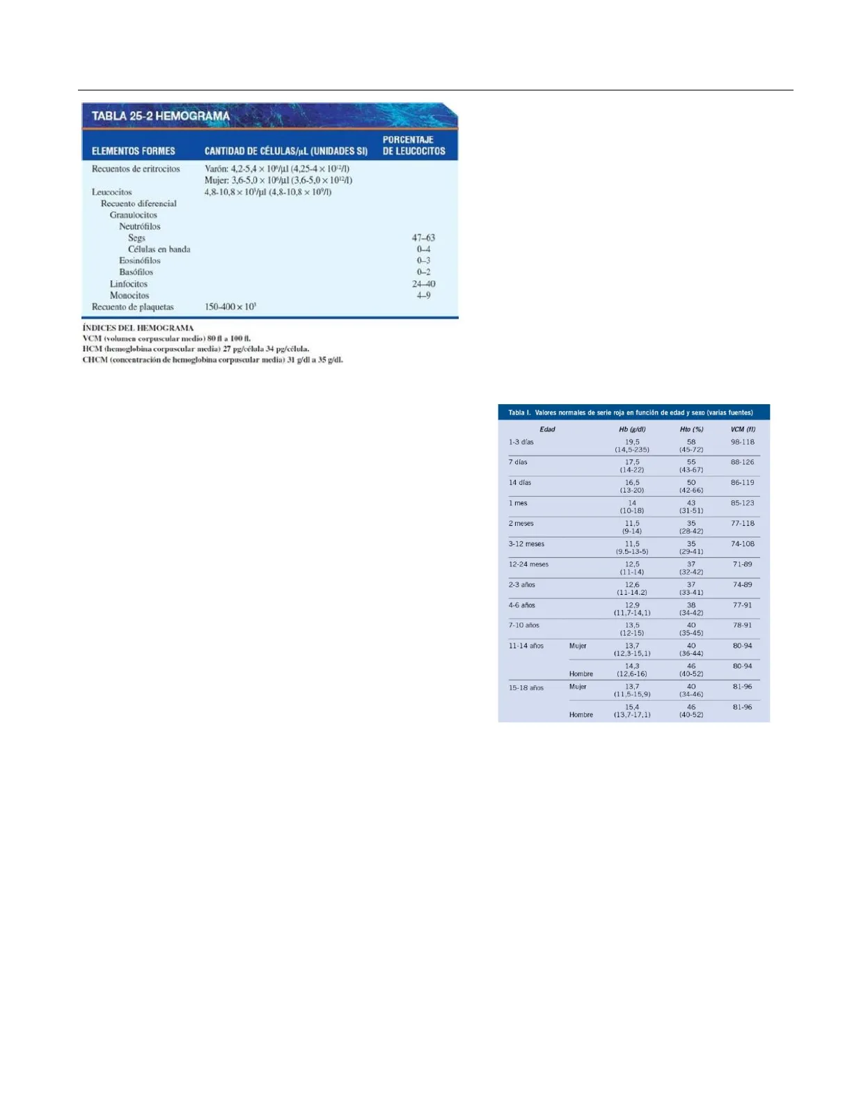 TABLA 25-2 HEMOGRAMA ELEMENTOS FORMES CANTIDAD DE CÉLULAS/AL (UNIDADES SI) PORCENTAJE DE LEUCOCITOS Recuentos de eritrocitos Varón: 4,2-5,4 x 10°/u] (4,25-4 × 1012/1) Mujer: 3,6-5,0 x 10°/ul (3,6-5,0 x 1012/1) 4,8-10,8 × 107/ul (4,8-10,8 x 10°/1) Leucocitos Recuento diferencial Granulocitos Neutrófilos Segs 47-63 Células en banda 0-4 Eosinófilos 0-3 Basófilos 0-2 Linfocitos 24-40 Monocitos 4-9 Recuento de plaquetas 150-400 ×101 ÍNDICES DEL HEMOGRAMA VCM (volumen corpuscular medio) 80 fl a 100 f. HCM (hemoglobina corpuscular media) 27 pg/célula 34 pg/célula. CHCM (concentración de hemoglobina corpuscular media) 31 g/dl a 35 g/dl.