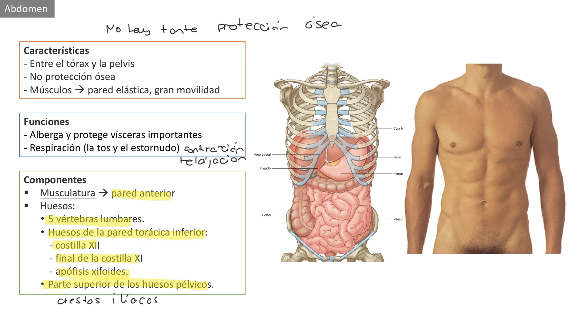 Diapositivas de Universitas Miguel Hernández sobre la musculatura abdominal. El Pdf detalla la anatomía, características, funciones y componentes óseos y musculares del abdomen, incluyendo la vascularización e inervación de los músculos oblicuo externo, oblicuo interno y transverso. Este recurso de Biología para Universidad, creado en 2023, es útil para comprender la laguna muscular y vascular.