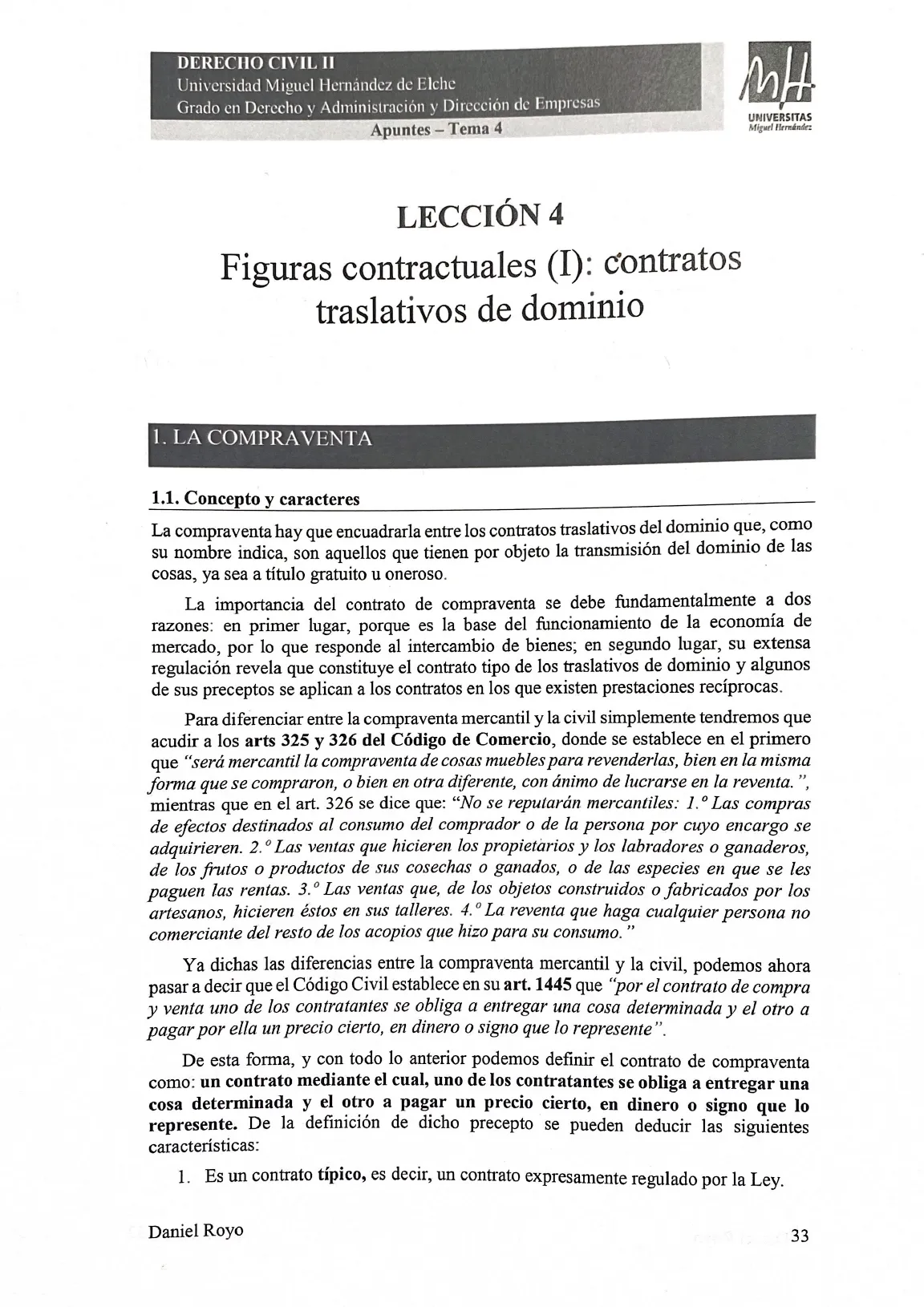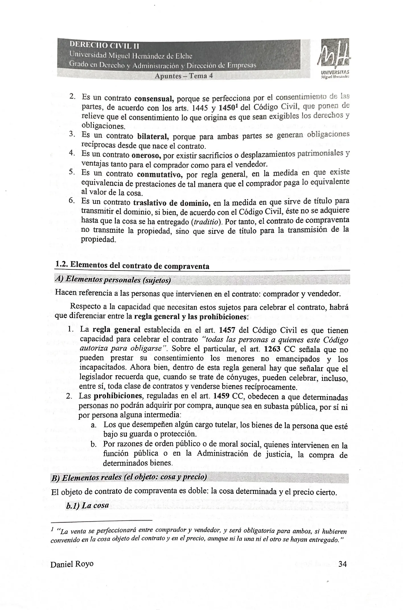 1 "La venta se perfeccionará entre comprador y vendedor, y será obligatoria para ambos, si hubieren convenido en la cosa objeto del contrato y en el precio, aunque ni la una ni el otro se hayan entregado." Daniel Royo 34DERECHO CIVIL II Universidad Miguel Hernández de Elche Grado en Derecho y Administración y Dirección de Empresas Apuntes - Tema 4 MH UNIVERSITAS Miguel Hernandez