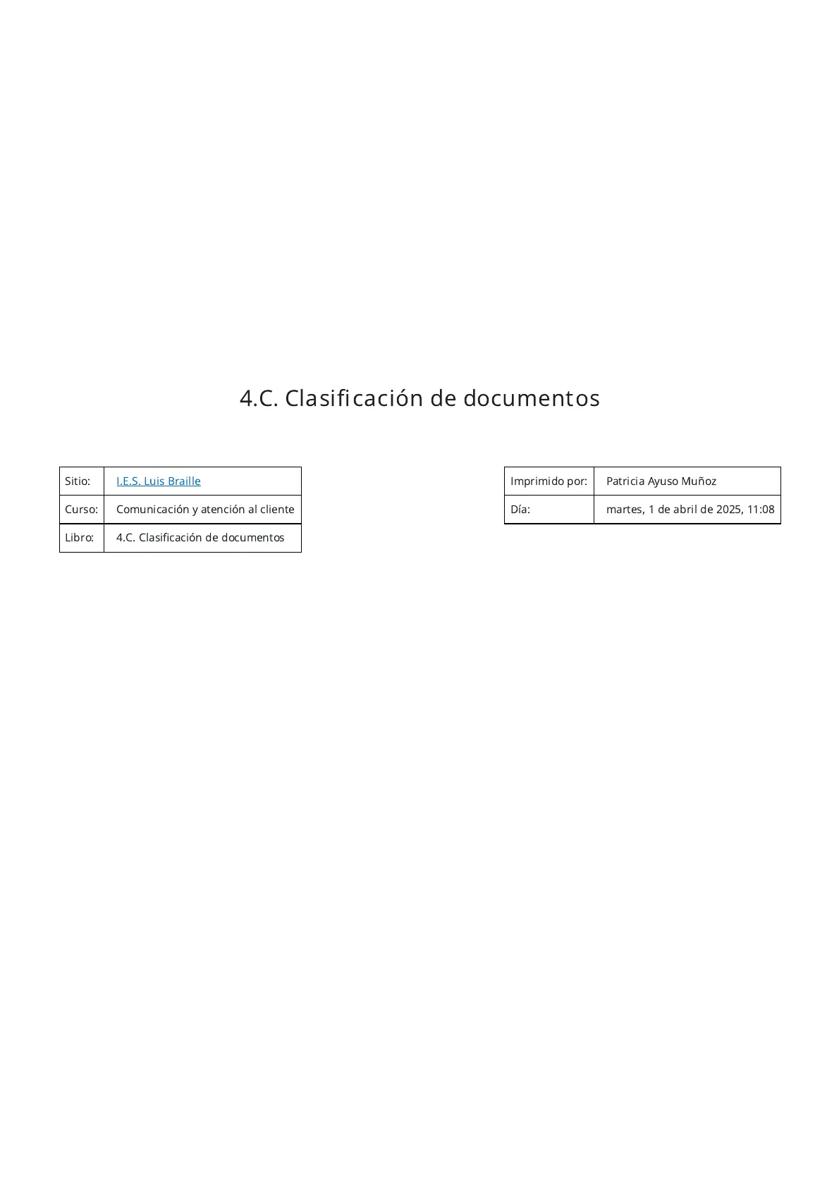 Sitio: I.E.S. Luis Braille Imprimido por: Patricia Ayuso Muñoz Curso: Comunicación y atención al cliente Día: martes, 1 de abril de 2025, 11:08 Libro: 4.C. Clasificación de documentosTabla de contenidos