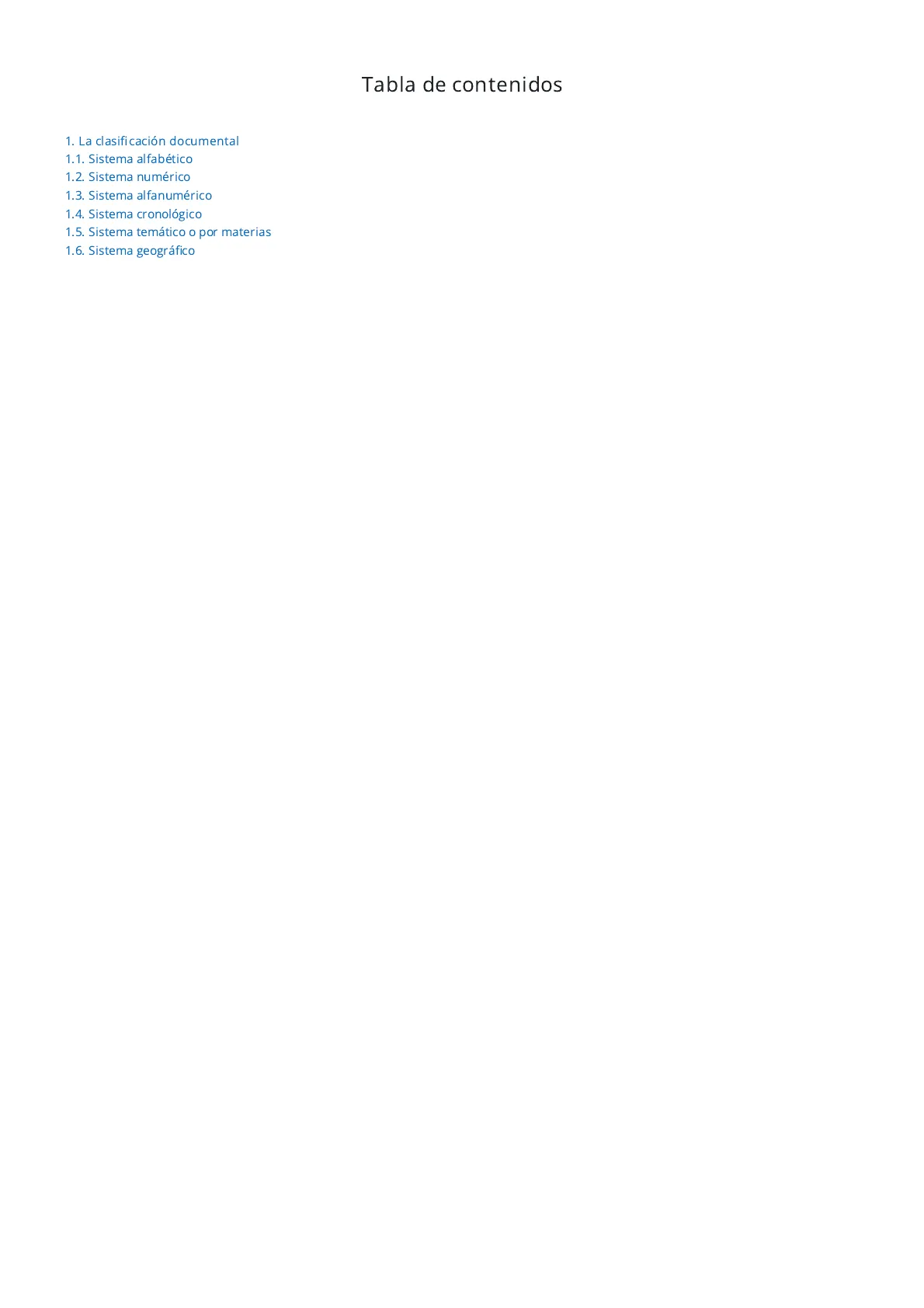 En el sistema de ordenación numérica los documentos se ordenan siguiendo el orden de los números naturales, de modo que se asigna un número a cada documento o se toma como referencia el número del propio documento (facturas, expedientes, etcétera.) 1 2 3 4 5 En el sistema numérico los documentos se ordenan según el orden de los números naturales. Ejemplo: El índice que encontramos al inicio de un informe o de un libro de texto. Caso resuelto: Comercial Molina debe ordenar las facturas del trimestre pasado que tienen la siguiente numeración: 789; 567; 897; 456; 566; 597. Solución Factura n.º 456 Factura n.º 566 Factura n.º 567 Factura n.º 597 Factura n.º 789 Factura n.º 897 Un sistema de clasificación diferente, que también utiliza los números como base de su ordenación es el sistema decimal. La clasificación decimal consiste en organizar los documentos en diez grandes grupos. Cada grupo contiene diferentes divisiones y subdivisiones de diez, del 0 al nueve, estableciendo los niveles necesarios para organizar la información. El ejemplo más característico utilizado por profesionales de la Gestión Administrativa es el Plan General Contable: Grupo 4. Acreedores y deudores por operaciones comerciales