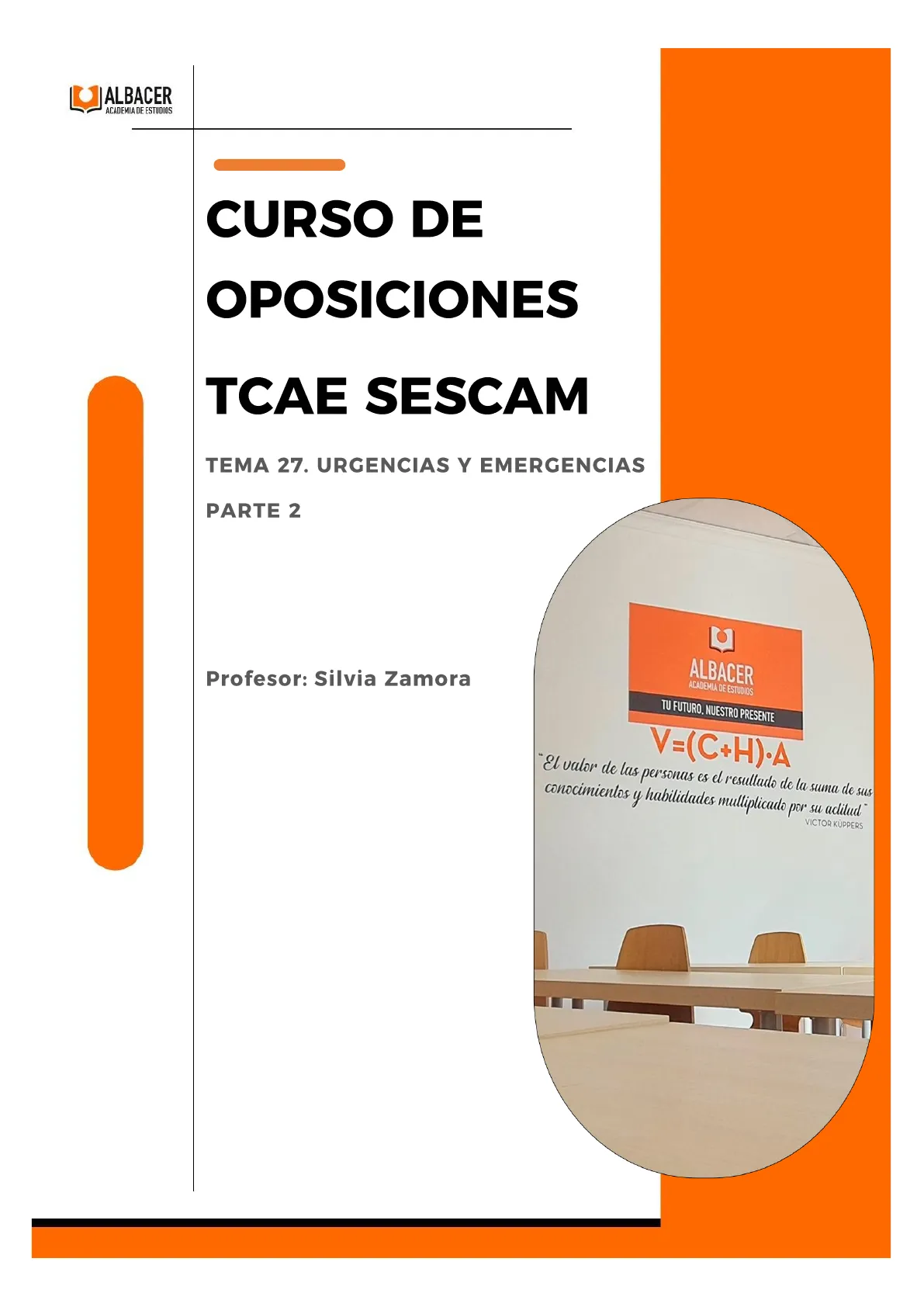Documento de Albacer Academia de Estudios sobre Curso de Oposiciones Tcae Sescam. El Pdf, enfocado en Oposiciones, aborda el Tema 27 de urgencias y emergencias, cubriendo primeros auxilios, reanimación cardiopulmonar básica y avanzada, y manejo de politraumatizados.