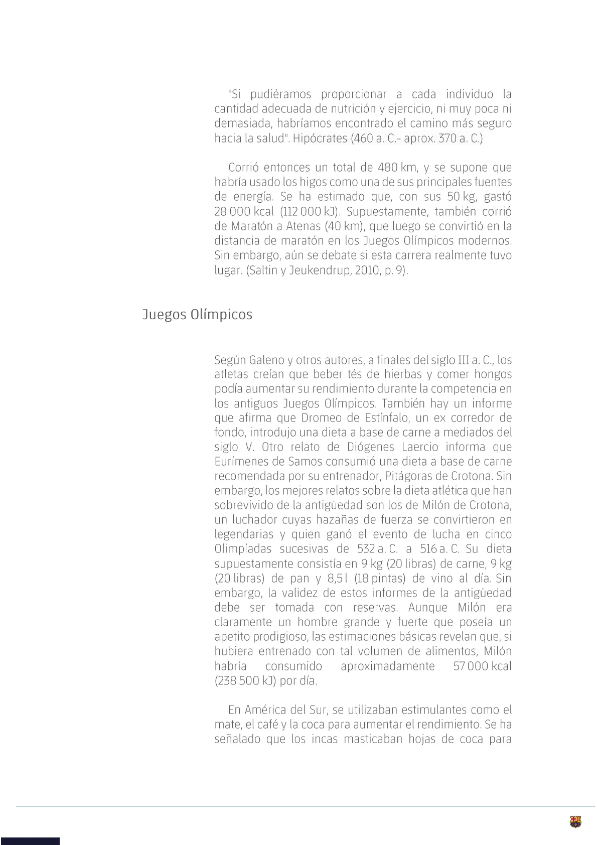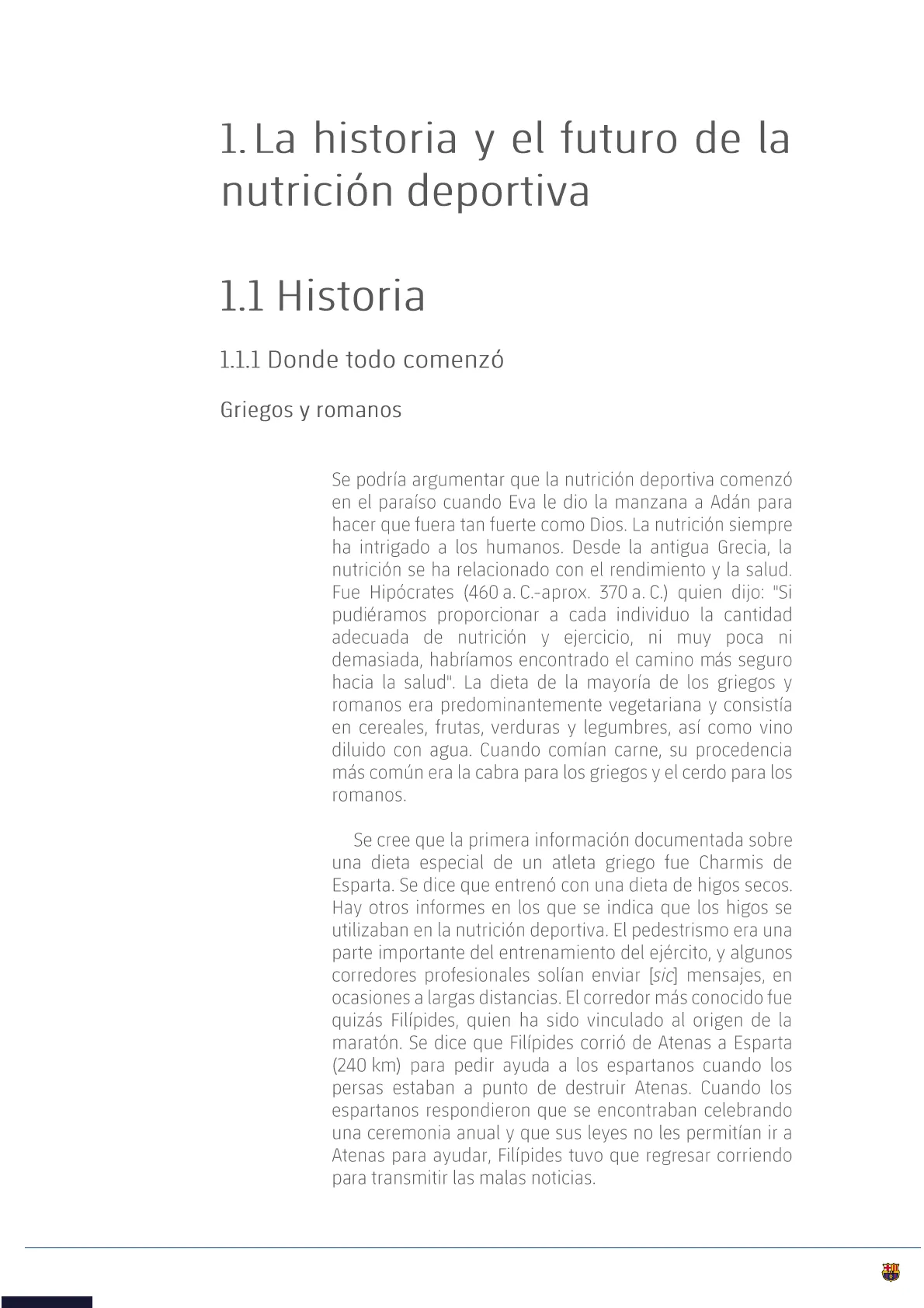 Se cree que la primera información documentada sobre una dieta especial de un atleta griego fue Charmis de Esparta. Se dice que entrenó con una dieta de higos secos. Hay otros informes en los que se indica que los higos se utilizaban en la nutrición deportiva. El pedestrismo era una parte importante del entrenamiento del ejército, y algunos corredores profesionales solían enviar [sic] mensajes, en ocasiones a largas distancias. El corredor más conocido fue quizás Filípides, quien ha sido vinculado al origen de la maratón. Se dice que Filípides corrió de Atenas a Esparta (240 km) para pedir ayuda a los espartanos cuando los persas estaban a punto de destruir Atenas. Cuando los espartanos respondieron que se encontraban celebrando una ceremonia anual y que sus leyes no les permitían ir a Atenas para ayudar, Filípides tuvo que regresar corriendo para transmitir las malas noticias."Si pudiéramos proporcionar a cada individuo la cantidad adecuada de nutrición y ejercicio, ni muy poca ni demasiada, habríamos encontrado el camino más seguro hacia la salud". Hipócrates (460 a. C .- aprox. 370 a. C.) Corrió entonces un total de 480 km, y se supone que habría usado los higos como una de sus principales fuentes de energía. Se ha estimado que, con sus 50 kg, gastó 28 000 kcal (112 000 kJ). Supuestamente, también corrió de Maratón a Atenas (40 km), que luego se convirtió en la distancia de maratón en los Juegos Olímpicos modernos. Sin embargo, aún se debate si esta carrera realmente tuvo lugar. (Saltin y Jeukendrup, 2010, p. 9).