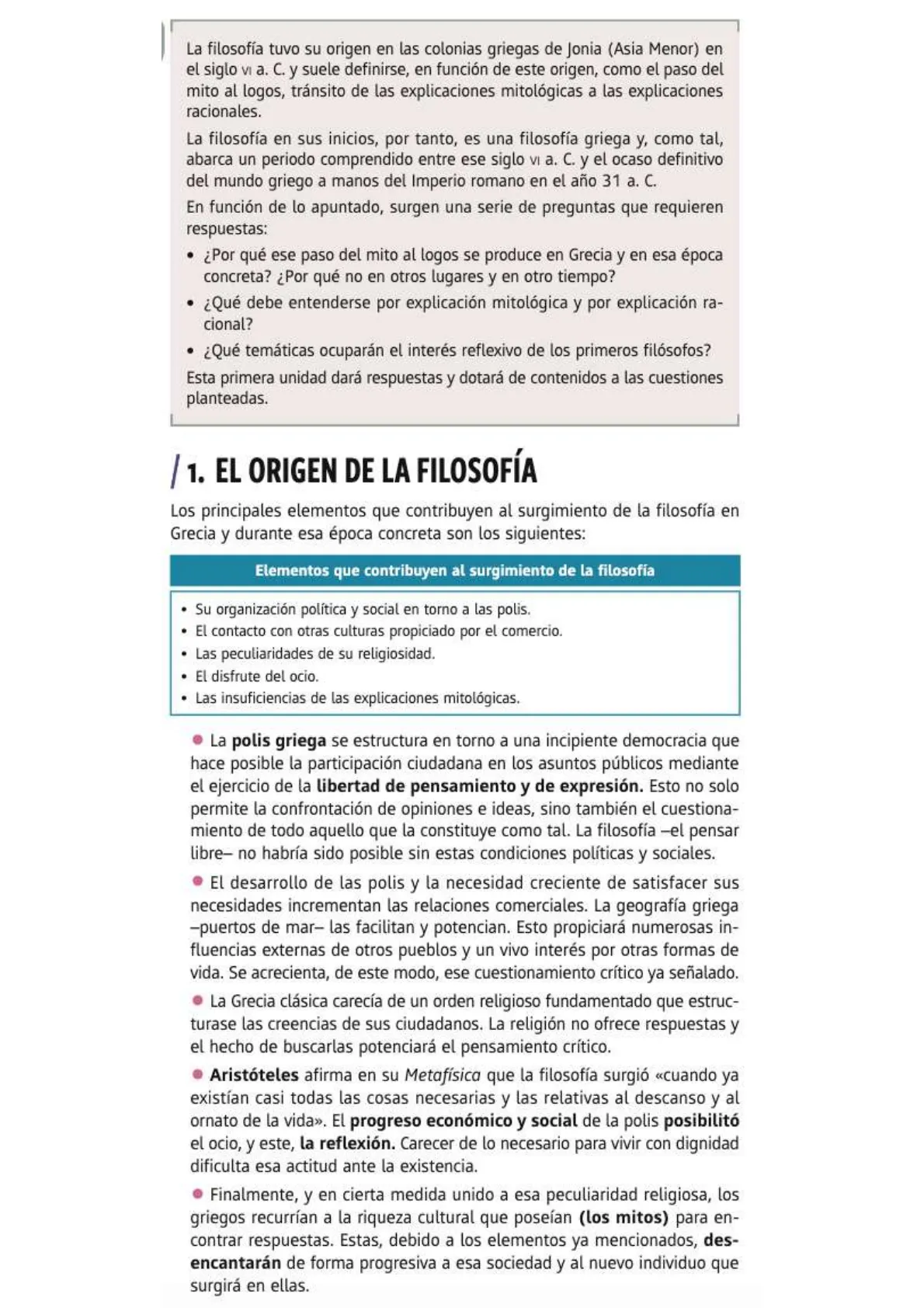 La filosofía tuvo su origen en las colonias griegas de Jonia (Asia Menor) en el siglo vi a. C. y suele definirse, en función de este origen, como el paso del mito al logos, tránsito de las explicaciones mitológicas a las explicaciones racionales.