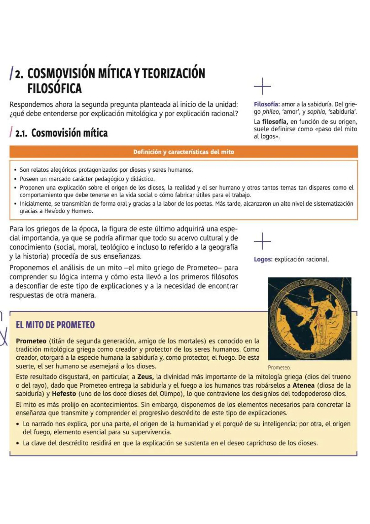 Proponemos el análisis de un mito -el mito griego de Prometeo- para comprender su lógica interna y cómo esta llevó a los primeros filósofos a desconfiar de este tipo de explicaciones y a la necesidad de encontrar respuestas de otra manera.