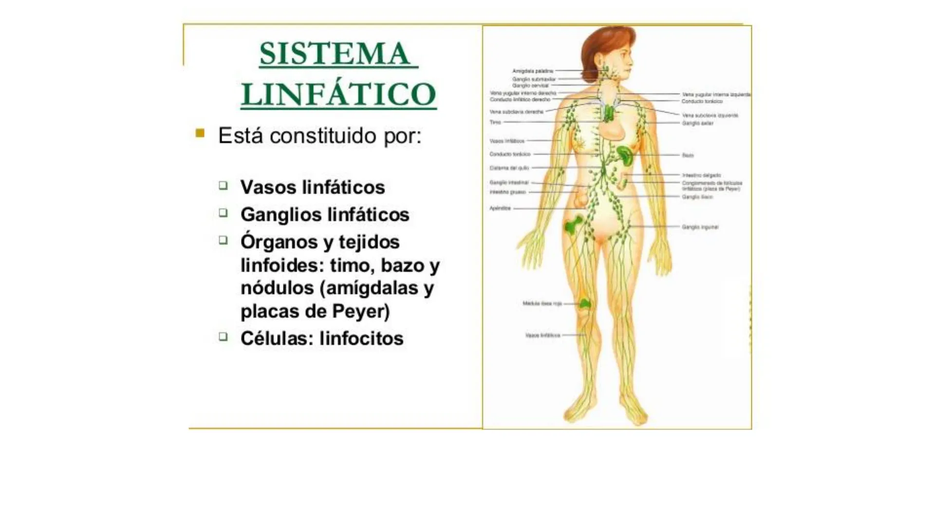 · Está constituido por: Vasos linfáticos Ganglios linfáticos Órganos y tejidos linfoides: timo, bazo y nódulos (amígdalas y placas de Peyer) Células: linfocitos Amiędića palatırı Ganglo bervica Mona yugular intamna dorechva Conducto Infitico derecho Viena paguber interna itazienda Conducto torácica Vena subclavia dersche Tirea Conducto torácico Visiting pramin- Gaigis lain Apineles