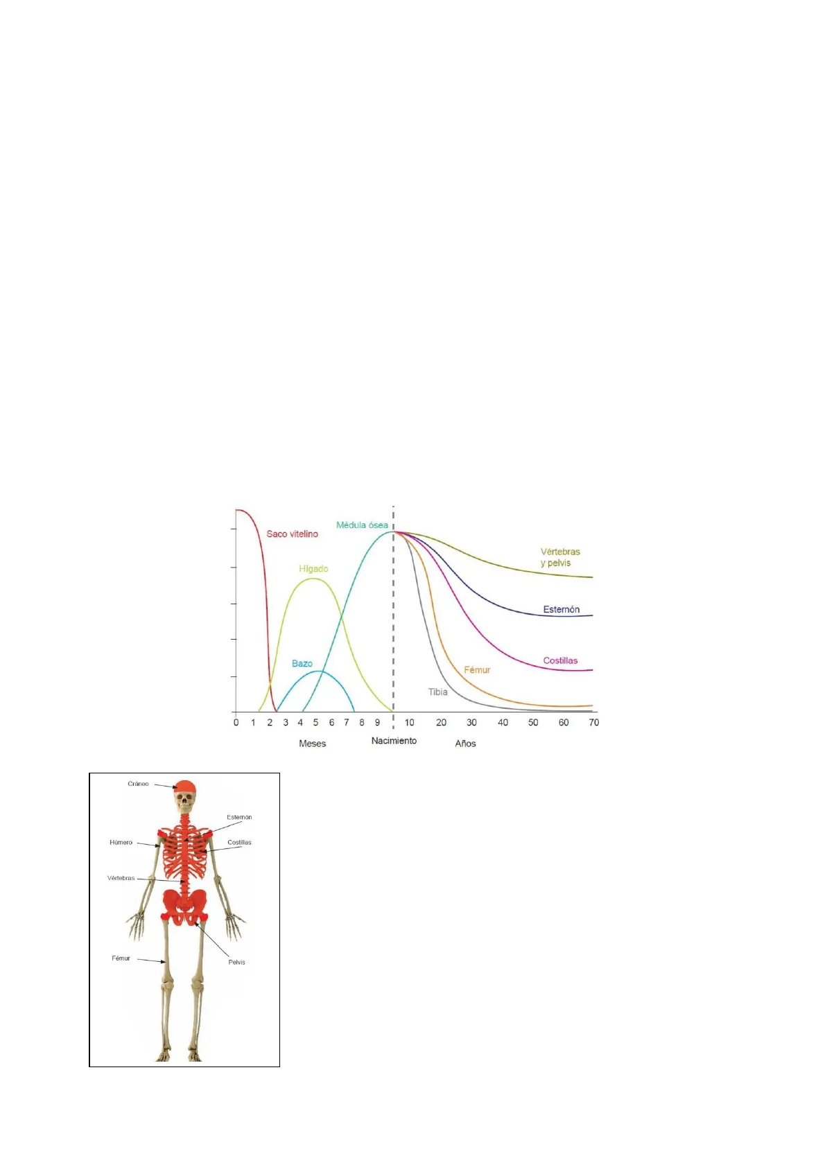 Médula ósea | Saco vitelino Vértebras y pelvis Higado Esternón Bazo Fémur 1 Tibia 0 1 2 3 4 5 6 7 8 9 10 20 30 40 50 60 70 Meses Nacimiento Años Cráneo Estemón Húmero Costillas Vértebras Fémur Pelvis
