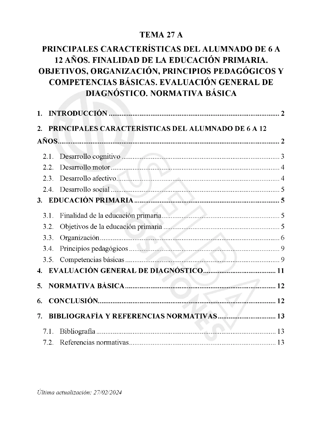 Documento sobre las principales características del alumnado de 6 a 12 años, la finalidad de la educación primaria, sus objetivos, organización, principios pedagógicos y competencias básicas. El Pdf, de Educación cívica para Universidad, incluye una evaluación general de diagnóstico y normativa básica, con un índice detallado que facilita la consulta de los temas tratados.