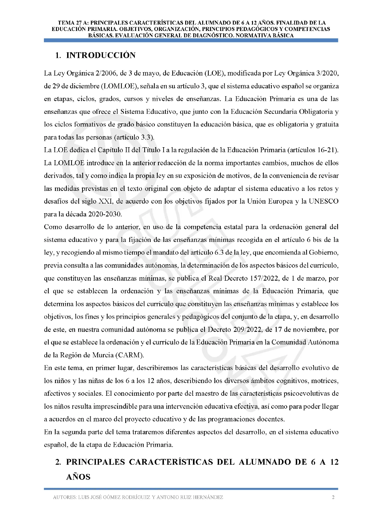 Como desarrollo de lo anterior, en uso de la competencia estatal para la ordenación general del sistema educativo y para la fijación de las enseñanzas mínimas recogida en el artículo 6 bis de la ley, y recogiendo al mismo tiempo el mandato del artículo 6.3 de la ley, que encomienda al Gobierno, previa consulta a las comunidades autónomas, la determinación de los aspectos básicos del currículo, que constituyen las enseñanzas mínimas, se publica el Real Decreto 157/2022, de 1 de marzo, por el que se establecen la ordenación y las enseñanzas mínimas de la Educación Primaria, que determina los aspectos básicos del currículo que constituyen las enseñanzas mínimas y establece los objetivos, los fines y los principios generales y pedagógicos del conjunto de la etapa, y, en desarrollo de este, en nuestra comunidad autónoma se publica el Decreto 209/2022, de 17 de noviembre, por el que se establece la ordenación y el currículo de la Educación Primaria en la Comunidad Autónoma de la Región de Murcia (CARM).