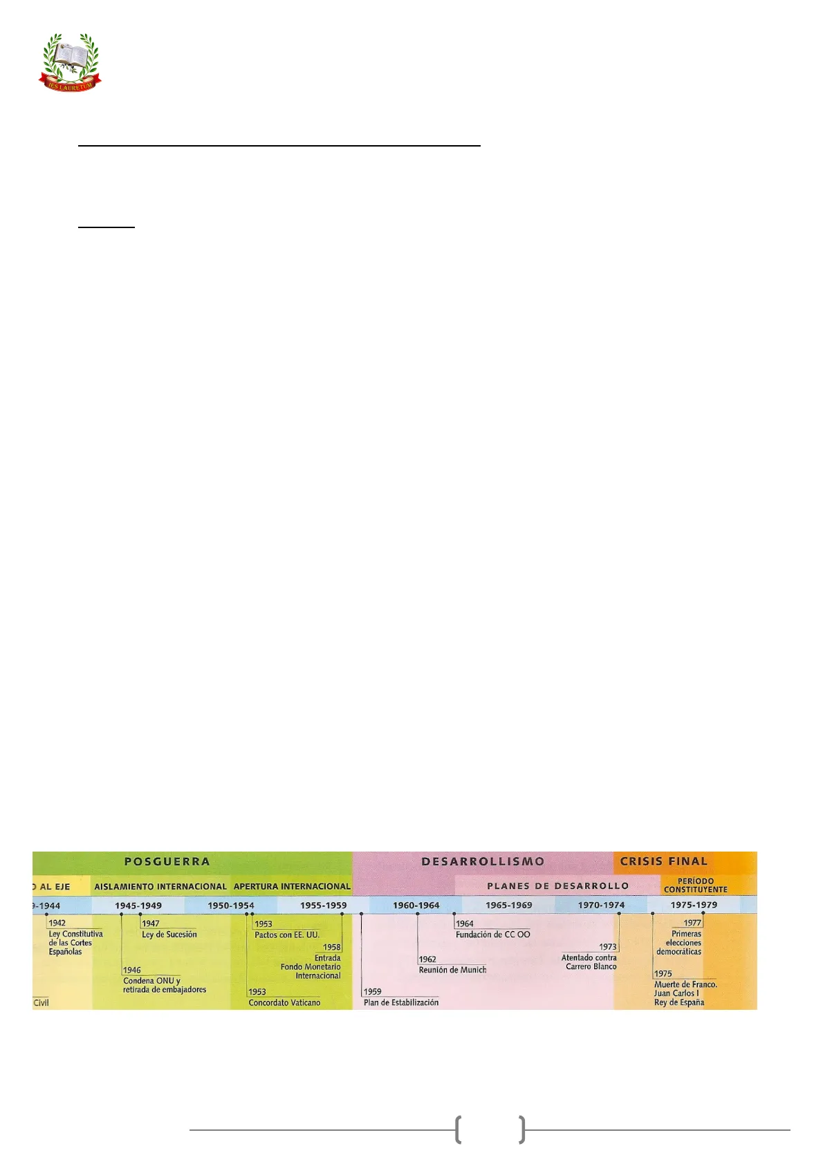 Documento del IES Lauretum sobre la Dictadura Franquista (1939-1975). El Pdf, de Bachillerato y de la materia Historia, analiza las bases ideológicas, la autarquía económica y el desarrollismo, incluyendo una timeline de eventos clave. Fue elaborado por un autor anónimo.