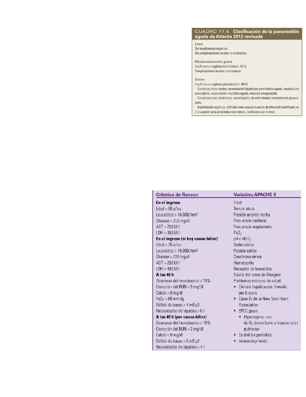 CUADRO 77.4 Clasificación de la pancreatitis aguda de Atlanta 2012 revisada Leve Sin insuficiencia orgánica. Sin complicaciones locales ni sistémicas. Moderadamente grave Insuficiencia orgánica transitoria (< 48 h). Complicaciones locales o sistémicas. Grave Insuficiencia orgánica persistente (> 48 h). Complicaciones locales: acumulación líquida peripancreática aguda, seudoquiste pancreático, acumulación necrótica aguda, necrosis encapsulada. Complicaciones sistémicas: exacerbación de enfermedad concomitante preexis- tente. Insuficiencia orgánica: definida como una puntuación de Marshall modificada de 2 o superior para el sistema respiratorio, cardiovascular o renal.