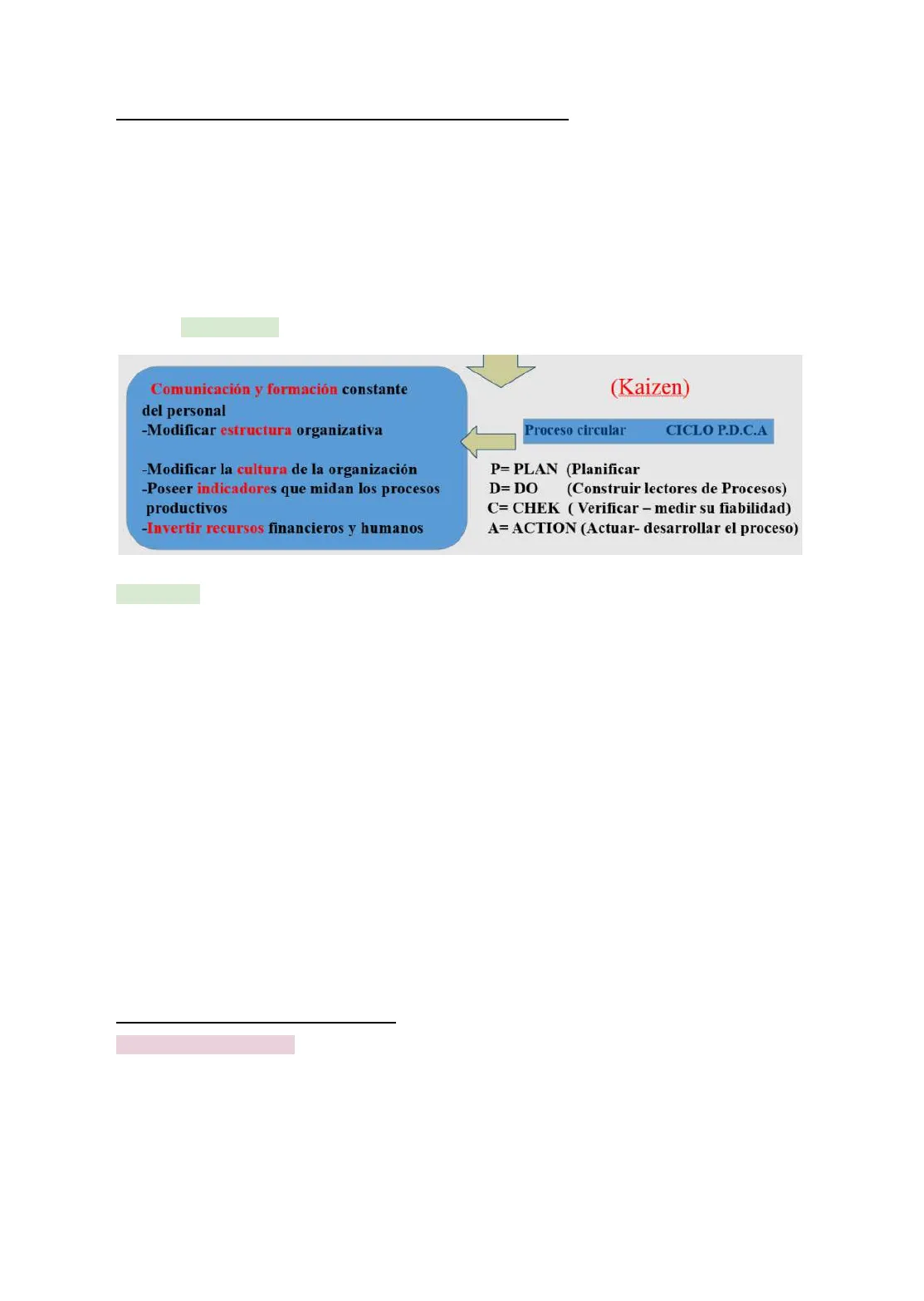 Comunicación y formación constante (Kaizen) del personal -Modificar estructura organizativa Proceso circular CICLO P.D.C.A -Modificar la cultura de la organización -Poseer indicadores que midan los procesos productivos -Invertir recursos financieros y humanos P= PLAN (Planificar D= DO (Construir lectores de Procesos) C= CHEK ( Verificar - medir su fiabilidad) A= ACTION (Actuar- desarrollar el proceso)