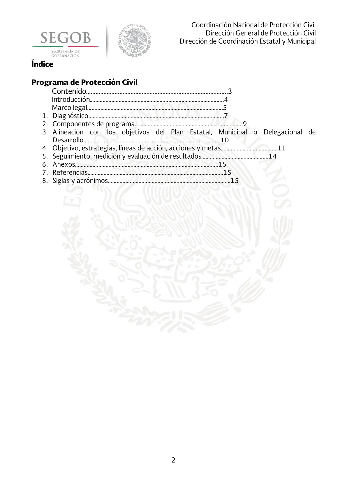 2 Programa Estatal de Protección Civil 2010-2015 de Sonora. 5SEGOB TADOS OS UNIDOS MEX CANOS 1 SECRETARÍA DE GOBERNACIÓN Coordinación Nacional de Protección Civil Dirección General de Protección Civil Dirección de Coordinación Estatal y Municipal