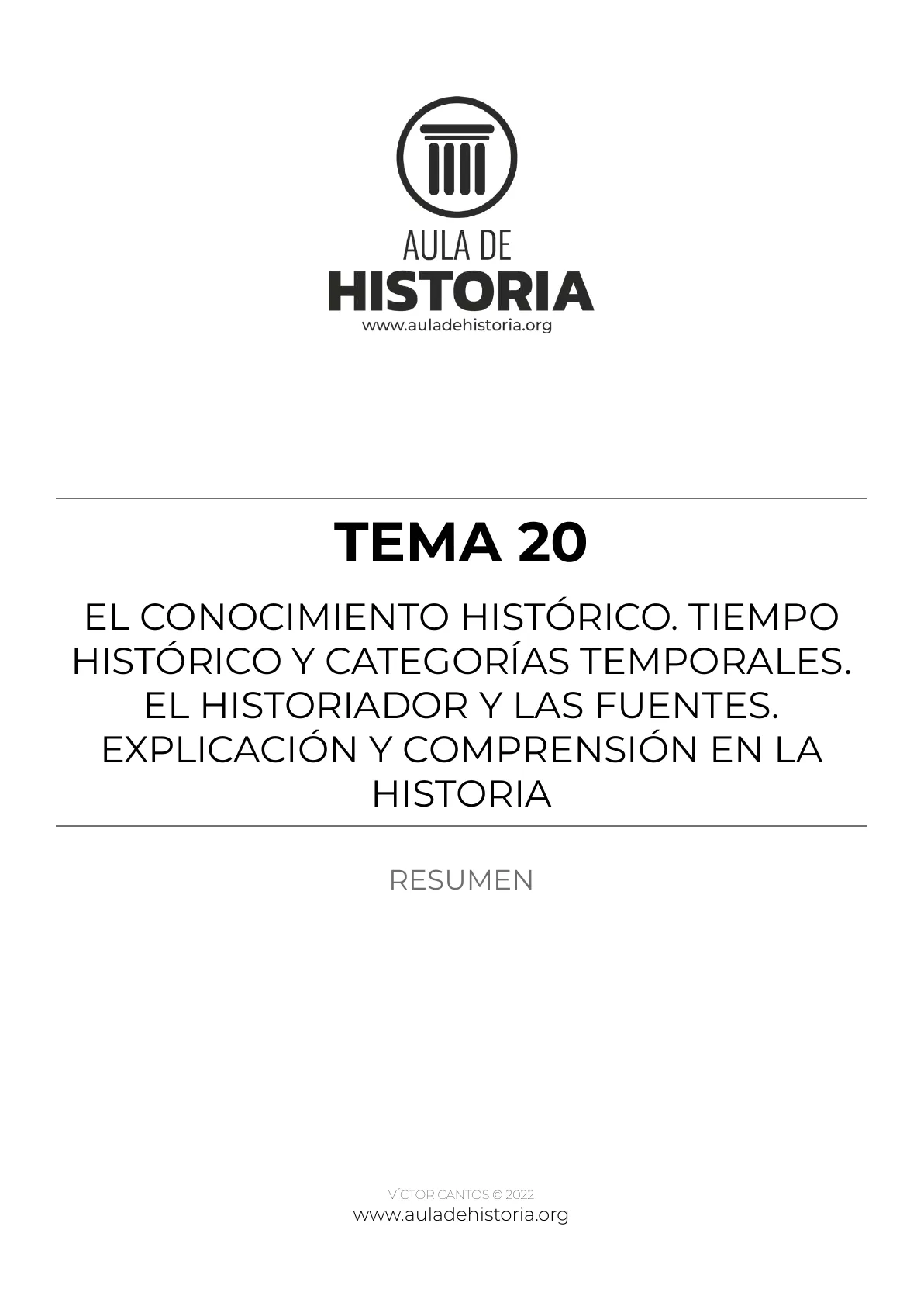 AULA DE HISTORIA ® RESUMEN 20 El conocimiento histórico. Tiempo histórico y categorías temporales El historiador y las fuentes. Explicación y comprensión en la Historia Producto licenciado a: Rubén Hernández Yunta · rubentrabajo95@gmail.com . ID 262342 - 2023-01-10 19:18:16