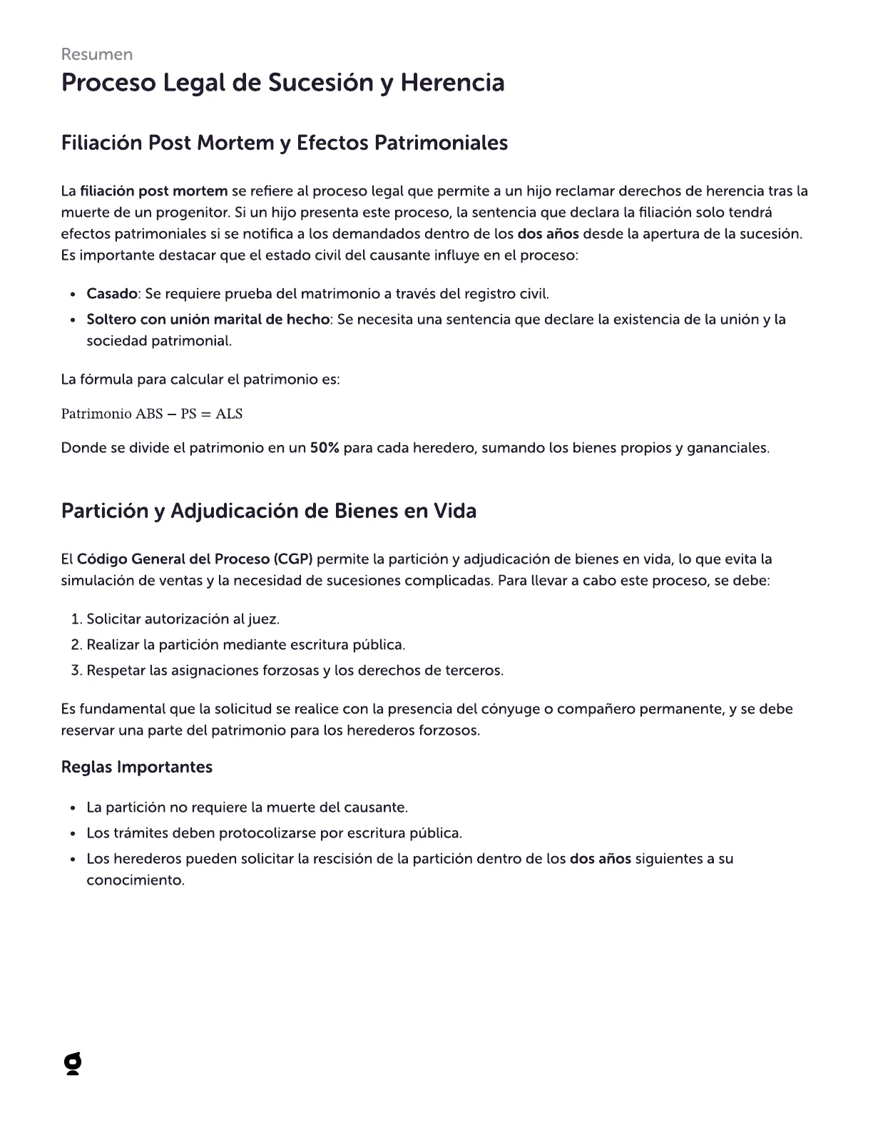 Documento de Algor Education sobre el Proceso Legal de Sucesión y Herencia. El Pdf detalla la filiación post mortem, la partición de bienes en vida y la apertura de la sucesión, abordando el manejo notarial y judicial de herencias según la Ley 446 de 1998, útil para estudiantes universitarios de Derecho.