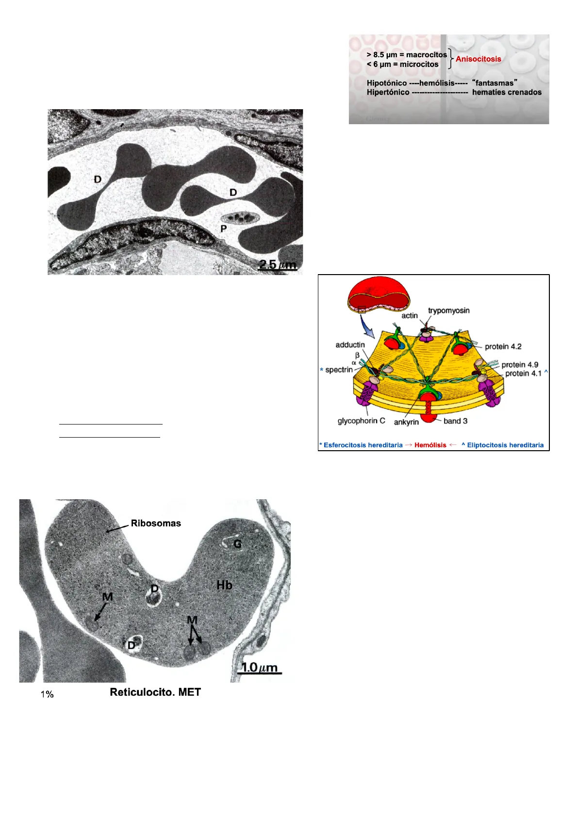 > 8.5 um = macrocitos } < 6 um = microcitos Anisocitosis Hipotónico ---- hemólisis ----- Hipertónico "fantasmas" hematíes crenados Giemsa Corte longitudinal de un capilar donde se observa el endotelio (epitelio simple plano) y los hematíes, siendo su contenido bastante homogéneo. En esta imagen se aprecian los discos bicóncavos. trypomyosin actin adductin protein 4.2 B * spectrin - protein 4.9 protein 4.1 ^ ODOL DODA glycophorin C ankyrin band 3 * Esferocitosis hereditaria -> Hemólisis - ^ Eliptocitosis hereditaria Ribosomas G Hb M M A D 1.0um 1% Reticulocito. MET ME de transmisión de un hematie inmaduro (también llamado reticulocito). En el se observan gran cantidad de orgánulos: tiene mitocondrias (M), mitocondrias en degeneración (D), aparato de Golgi (G), gran cantidad de ribosomas y hemoglobina (Hb) y ARN que precipita. Además, su forma no es de disco bicóncavo, como en el caso del hematie maduro.Para identificar los hematíes inmaduros o reticulocitos se usa la tinción azul brillante de cresil que tiñe el ARN precipitado, que solo está presente en estos hematíes inmaduros.