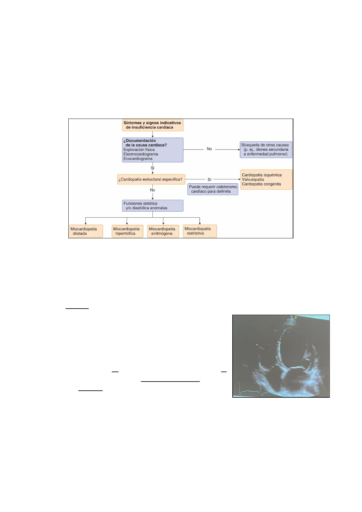Síntomas y signos indicativos de insuficiencia cardíaca ¿Documentación de la causa cardíaca? Exploración física Electrocardiograma Ecocardiograma No Búsqueda de otras causas (p. ej., disnea secundaria a enfermedad pulmonar) Si ¿Cardiopatía estructural específica? Sí Cardiopatía isquémica Valvulopatía Cardiopatía congénita No Puede requerir cateterismo cardíaco para definirla Funciones sistólica y/o diastólica anómalas Miocardiopatía dilatada Miocardiopatía hipertrófica Miocardiopatía arritmógena Miocardiopatía restrictiva