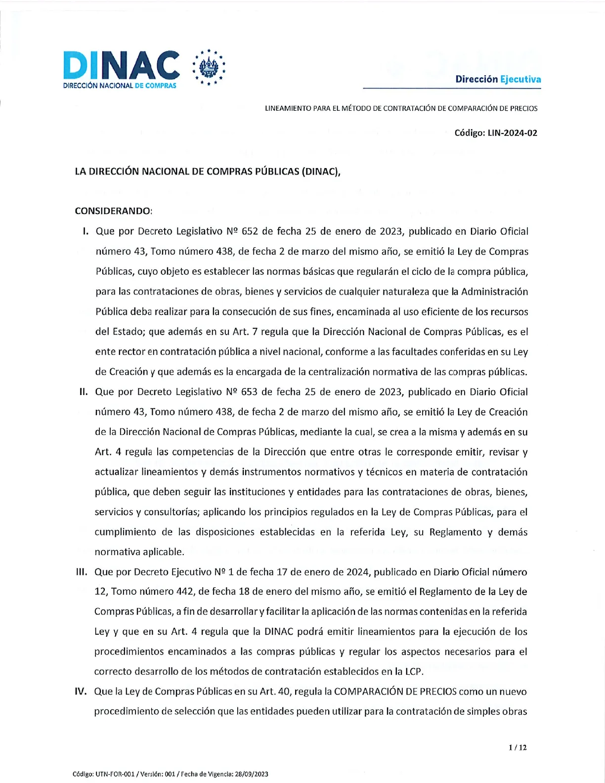 LINEAMIENTO PARA EL MÉTODO DE CONTRATACIÓN DE COMPARACIÓN DE PRECIOS Código: LIN-2024-02 LA DIRECCIÓN NACIONAL DE COMPRAS PÚBLICAS (DINAC), CONSIDERANDO: