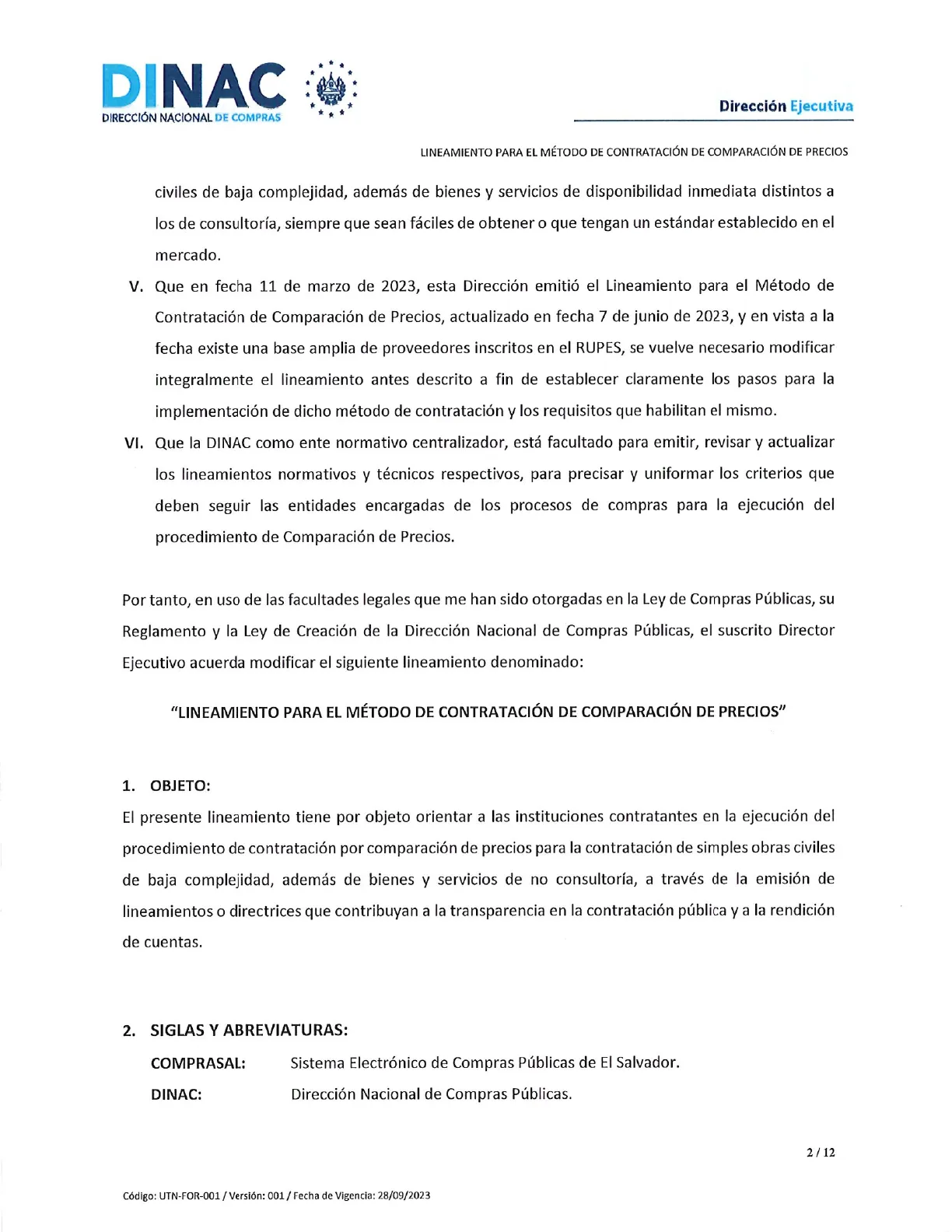 2. SIGLAS Y ABREVIATURAS: COMPRASAL: Sistema Electrónico de Compras Públicas de El Salvador. DINAC: Dirección Nacional de Compras Públicas. Código: UTN-FOR-001 / Versión: 001 / Fecha de Vigencia: 28/09/2023 2/ 12DINAC DIRECCIÓN NACIONAL DE COMPRAS Dirección Ejecutiva LINEAMIENTO PARA EL MÉTODO DE CONTRATACIÓN DE COMPARACIÓN DE PRECIOS DSC: Documento de Solicitud de Cotizaciones. LCP: Ley de Compras Públicas. LPA: Ley de Procedimientos Administrativos. PAC: Planificación Anual de Compras. PEO: Panel de Evaluación. PIP: Plan de Implementación del Proceso. RLCP: Reglamento de la Ley de Compras Públicas. UCP: Unidad de Compras Públicas. UFI: Unidad Financiera Institucional. US: Unidad Solicitante.