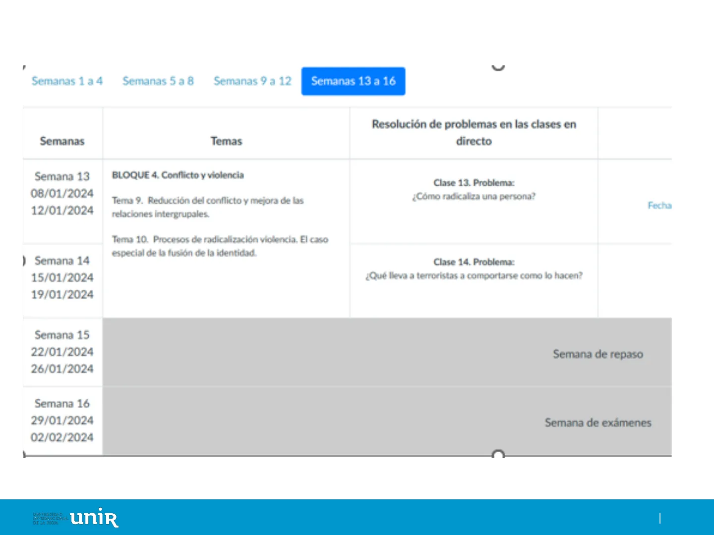 Tema 10: Procesos de radicalización violenta uniR UNIVERSIDAD INTERNACIONAL DE LA RIOJA La Universidad en InternetSemanas 1 a 4 Semanas 5 a 8 Semanas 9 a 12 Semanas 13 a 16