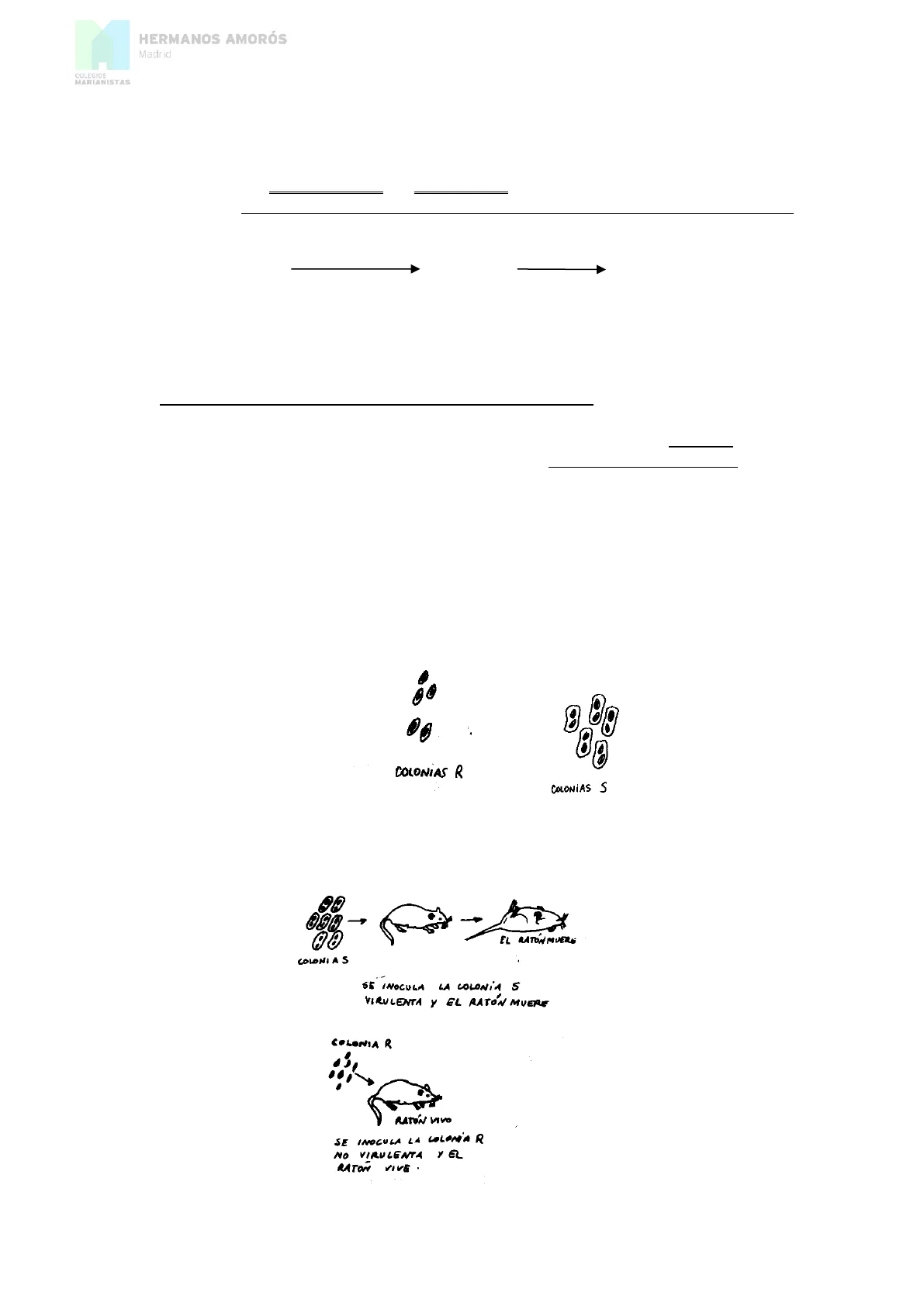 Inoculo 2 bacterias juntas y una le transfirió la virulencia a la otra (forma de reproducción en bacterias). La virulencia esta en el ADN, por lo que el ADN ES EL MATERIAL HEREDITARIO (demostrado por Avery y colaboradores)