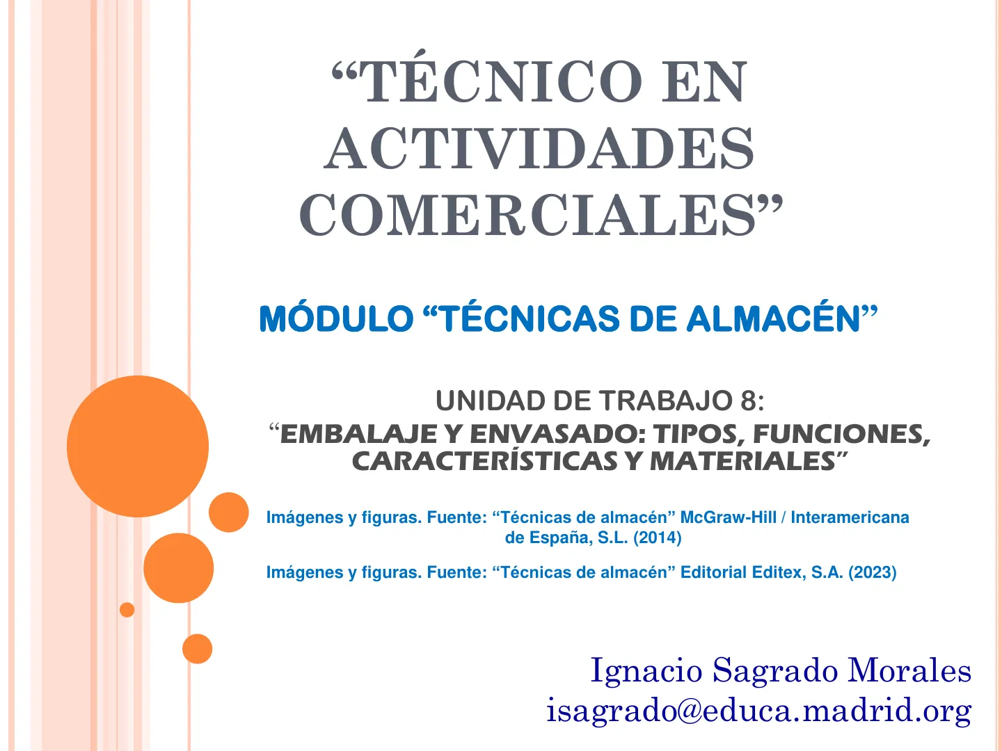 UNIDAD DE TRABAJO 8: "EMBALAJE Y ENVASADO: TIPOS, FUNCIONES, CARACTERÍSTICAS Y MATERIALES" Imágenes y figuras. Fuente: "Técnicas de almacén" McGraw-Hill / Interamericana de España, S.L. (2014) Imágenes y figuras. Fuente: "Técnicas de almacén" Editorial Editex, S.A. (2023) Ignacio Sagrado Morales isagrado@educa.madrid.org