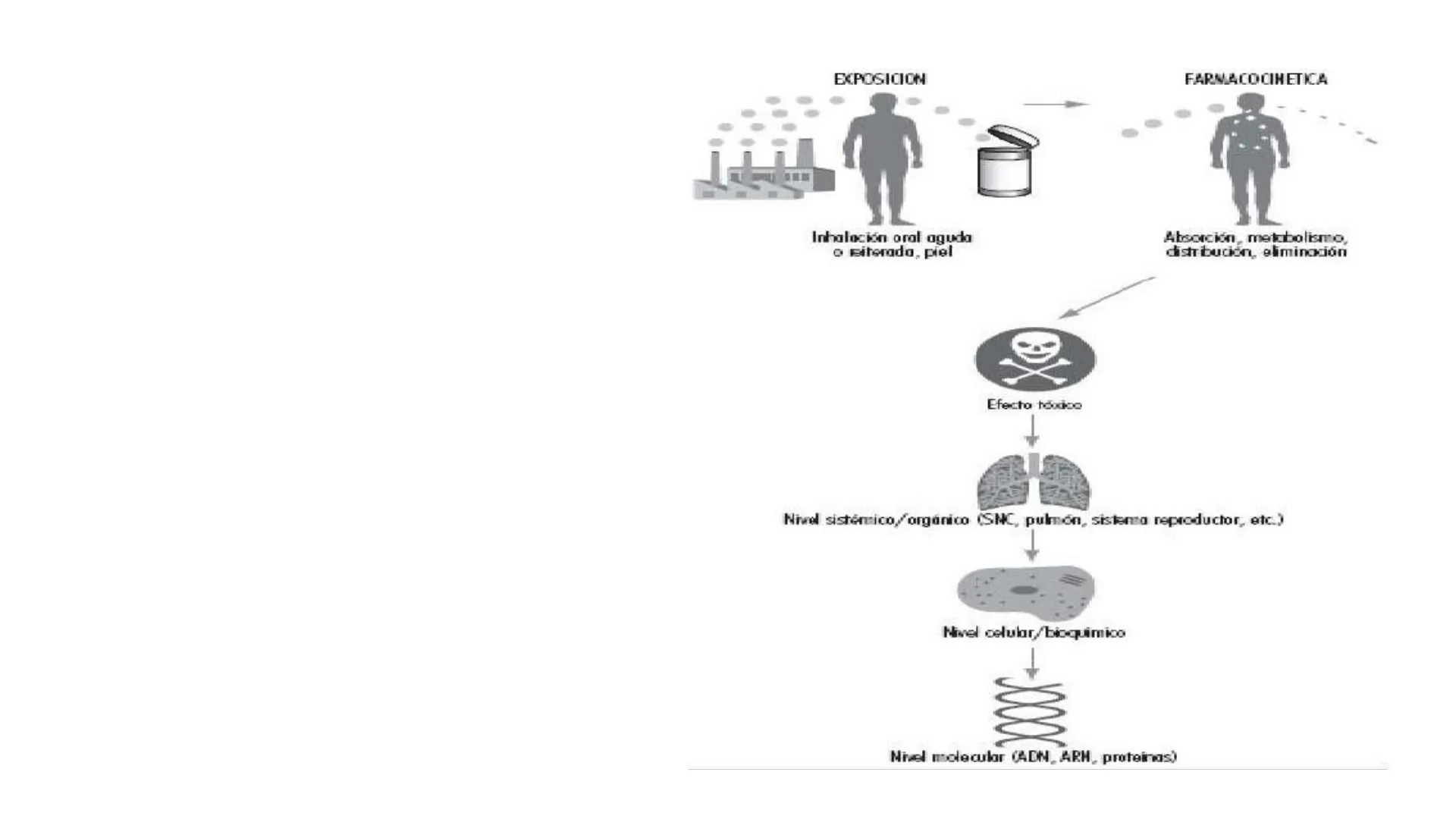 Inhalación oral aguda o Biterada, piel Absorción, metabolismo, distribución, eliminación Efecto toodoo Nivel sistémico,/orgánico (SNC, pulmón, sistema reproductor, etc.) Nivel celular/bioquímico Nivel molecular (ADN_ARH, proteinas)Mecanismos responsables de la manifestación de la toxicidad: ¿Cómo entra un tóxico en un organismo?, ¿cómo interactúa con moléculas diana? y ¿cómo el organismo lo afronta?